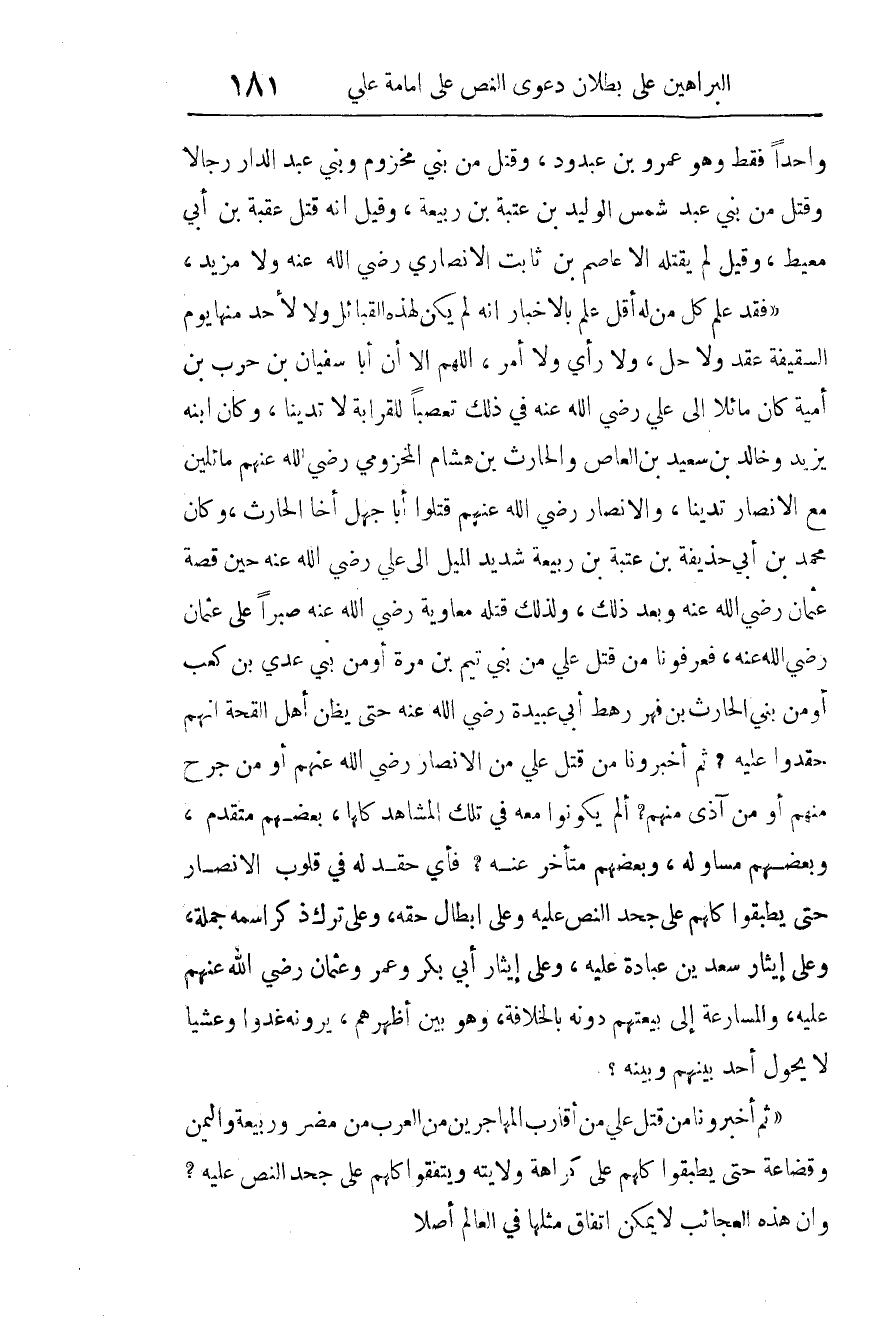 ثم أخبرونا مَنْ قتل علي مِنْ أقارب المهاجرين من العرب من مضر وربيعة، واليمن وقضاعة حتى يطبقوا كلهم على كراهة ولايته، ويتفقوا كلهم على جحد النص عليه؟ وإن هذه العجائب لا يمكن اتفاق مثلها في العالم أصلا