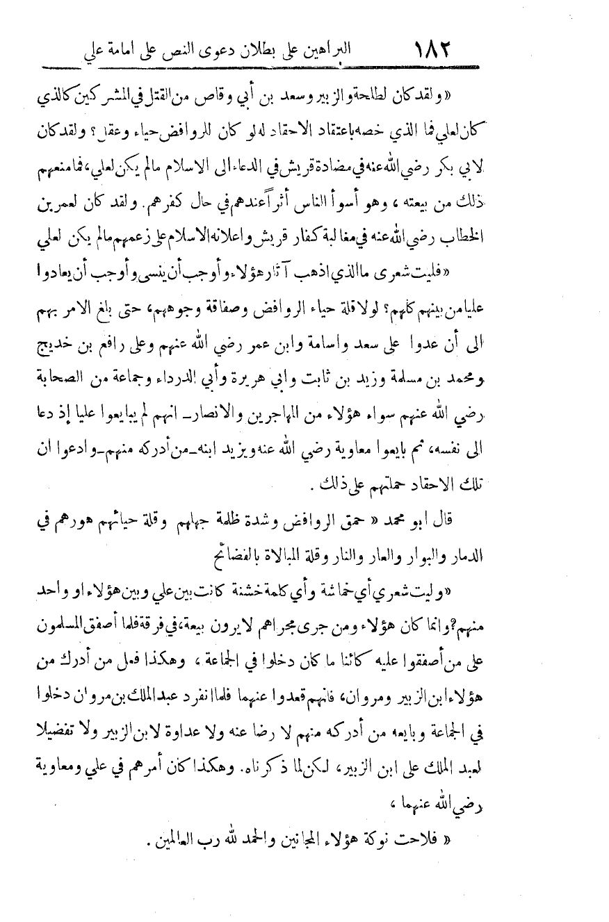 فليت شعري! ما الذي أذهب آثار هؤلاء، وأوجب أن ينسى، وأوجب أن يعادوا عليا من بينهم كلهم؟ لولا قلة حياء الروافض، وصفاقة وجوههم، حتى بلغ الأمر بهم إلى أن عدوا على سعد وأسامة وابن عمر رضي الله عنهم، وعلى رافع بن خديج، ومحمد بن مسلمة، وزيد بن ثابت، وأبي هريرة، وأبي الدرداء، وجماعة من الصحابة -رضي الله عنهم- سواء هؤلاء من المهاجرين والأنصار - أنهم لم يبايعوا عليا إذ دعا إلى نفسه، ثم بايعوا معاوية -رضي الله عنه-، ويزيد ابنه -من أدركه منهم-، وادعوا أن تلك الأحقاد حملتهم على ذلك.
