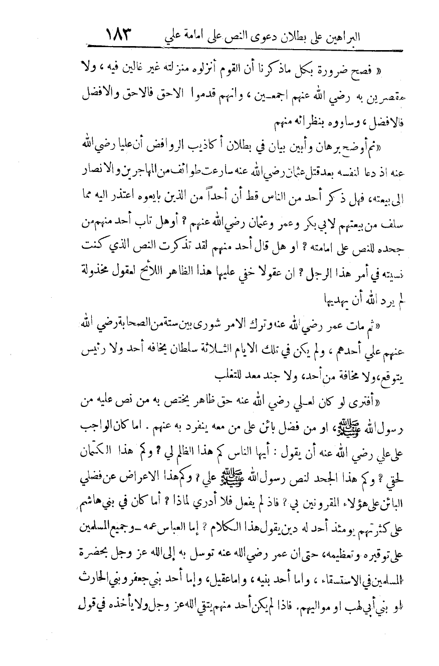"ثمَّ أوضح برهَان وَأبين بَيَان فِي بطلَان أكاذيب الروافض أَن عليا رَضِي الله عَنهُ إذ دعا لنَفسه بعد قتل عُثْمَان رَضِي الله عَنهُ سارعت طوائف من الْمُهَاجِرين وَالْأَنْصَار إِلَى بيعَته، فَهَل ذكر أحد من النَّاس قط أن أحدًا مِن الذين بايعوه اعتذر إِلَيْهِ مِمَّا سلف من بيعتهم لأبي بكر وَعمر وَعُثْمَان رضي الله عنهم؟ أَو هَل تَابَ أحد مِنْهُم من جَحده للنَّص على إِمَامَته؟ أَو هل قَالَ أحد مِنْهُم: لقد ذكرت النَّص الَّذِي كنت نسيته فِي أَمر هَذَا الرجل؟ إن عقولاً خَفِي عَلَيْهَا هَذَا الظَّاهِر اللائح لَعقول مخذولة لم يرد الله أَن يهديها.