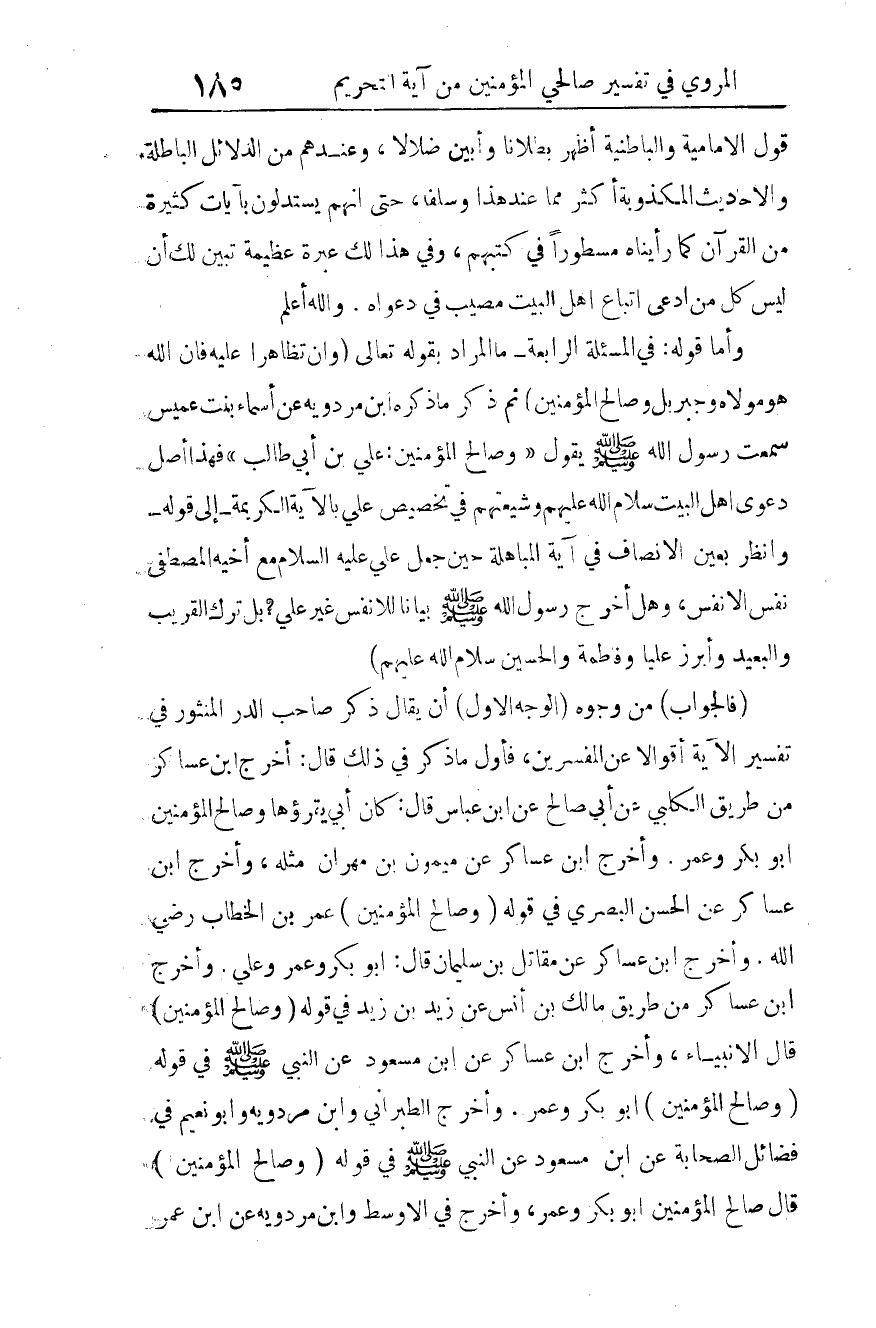 وأما قوله في المسألة الرابعة: ما المراد بقوله -تعالى-: {وَإِنْ تَظَاهَرَا عَلَيْهِ فَإِنَّ اللَّهَ هُوَ مَوْلاهُ وَجِبْرِيلُ وَصَالِحُ الْمُؤْمِنِينَ} 1 ثم ذكر ما ذكره ابن مردويه عن أسماء بنت عميس: سمعت رسول الله صلى الله عليه وسلم يقول: "وصالح المؤمنين: علي بن أبي طالب"، فهذا أصل دعوى أهل البيت -سلام الله عليهم- وشيعتهم في تخصيص عليّ بالآية الكريمة ... إلى قوله: "وانظر بعين الإنصاف في آية المباهلة حين جعل علي -عليه السلام- مع أخيه المصطفى نفس الأنفس، وهل أخرج رسول الله صلى الله عليه وسلم بيانا للأنفس غير علي؟ بل ترك القريب والبعيد، وأبرز عليا وفاطمة والحسين سلام الله عليهم).