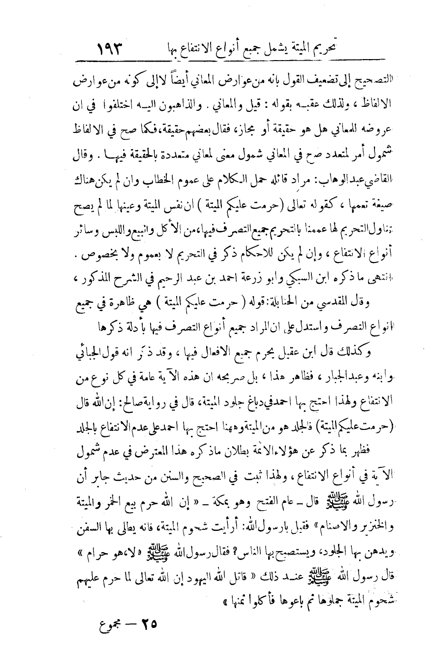 فظهر بما ذكر عن هؤلاء الأئمة بطلان ما ذكره هذا المعترض في عدم شمول الآية في أنواع الانتفاع؛ ولهذا ثبت في الصحيح والسنن من حديث جابر أن رسول الله صلى الله عليه وسلم قال -عام الفتح وهو بمكة-: "إن الله حرم بيع الخمر والميتة والخنْزير والأصنام. فقيل: يا رسول الله أرأيت شحوم الميتة، فإنه يطلى بها السفن، ويدهن بها الجلود، ويستصبح بها الناس؟ فقال رسول الله صلى الله عليه وسلم: لا، هو حرام. قال رسول الله صلى الله عليه وسلم عند ذلك: قاتل الله اليهود، إن الله -تعالى- لما حرم عليهم شحوم الميتة جملوها، ثم باعوها فأكلوا ثمنها"4.