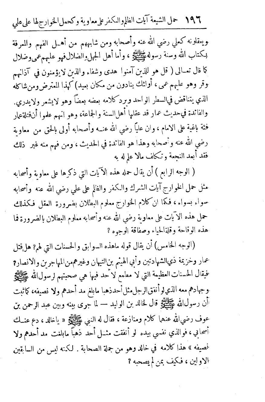 (الوجه الرابع): أن يقال: حمله هذه الآيات التي ذكرها على معاوية وأصحابه مثل حمل الخوارج آيات الشرك والكفر والظلم على علي رضي الله عنه وأصحابه سواء بسواء، فكما أن كلام الخوارج معلوم البطلان بضرورة العقل، فكذلك حمل هذه الآيات على معاوية رضي الله عنه وأصحابه معلوم البطلان بالضرورة. فما هذه الوقاحة، وقلة الحياء، وصفاقة الوجوه؟!