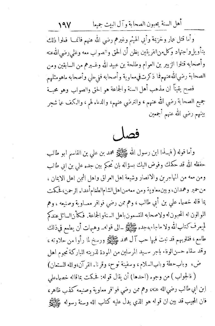 فكأن السائل عندكم لم يعرف كتاب الله، ولا ما جاء به جده صلى الله عليه وسلم ... إلى قوله: وهيهات أن يطمع في ذلك طامع، فقلوبهم قد نبت فيها حب آل محمد صلى الله عليه وسلم ورسخ لما رأوا من حلاوته، وقد سقاه حسن الوفاء بأجر سيد المرسلين من المودة لذريته المباركة، نجوم أهل الأرض، وباب حطة، وباب السلام، وسفينة نوح، وقرناء القرآن، والله المستعان).