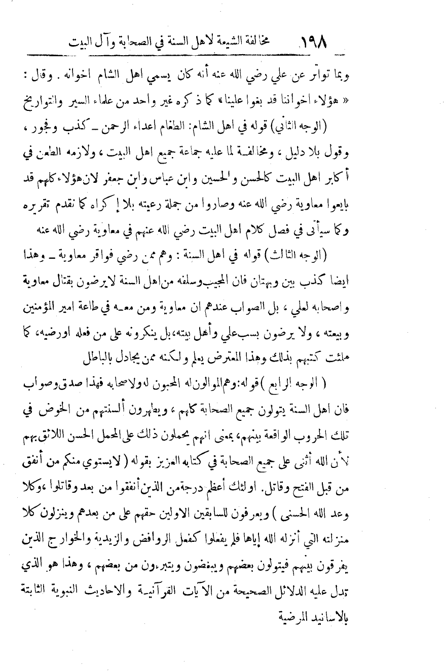 (الوجه الثاني): قوله في أهل الشام: الطغام أعداء الرحمن، كذب وفجور، وقول بلا دليل، ومخالفة لما عليه جماعة جميع أهل البيت، ولازمه الطعن في أكابر أهل البيت كالحسن والحسين، وابن عباس وابن جعفر؛ لأن هؤلاء كلهم قد بايعوا معاوية -رضي الله عنه- وصاروا من جملة رعيته بلا إكراه كما تقدم تقريره، وكما سيأتي في فصل كلام أهل البيت -رضي الله عنهم- في معاوية رضي الله عنه.