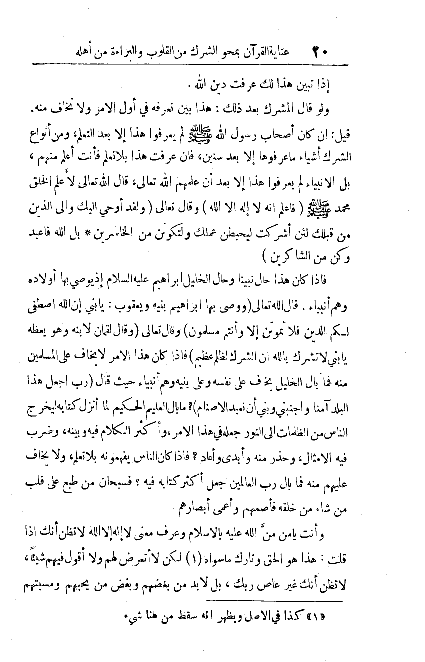 فإذا كان هذا حال نبينا، وحال الخليل إبراهيم -عليه السلام- إذ يوصي بها أولاده وهم أنبياء. قال الله تعالى: {وَوَصَّى بِهَا إِبْرَاهِيمُ بَنِيهِ وَيَعْقُوبُ يَا بَنِيَّ إِنَّ اللَّهَ اصْطَفَى لَكُمُ الدِّينَ فَلا تَمُوتُنَّ إِلَّا وَأَنْتُمْ مُسْلِمُونَ} 3. وقال تعالى: {وَإِذْ قَالَ لُقْمَانُ لاِبْنِهِ وَهُوَ يَعِظُهُ يَا بُنَيَّ لا تُشْرِكْ بِاللَّهِ إِنَّ الشِّرْكَ لَظُلْمٌ عَظِيمٌ} 4؛ فإذا كان هذا الأمر لا يخاف على المسلمين منه، فما بال الخليل يخاف على نفسه وعلى بنيه، وهم أنبياء؛ حيث قال: {رَبِّ اجْعَلْ هَذَا الْبَلَدَ آمِنًا وَاجْنُبْنِي وَبَنِيَّ أَنْ نَعْبُدَ الأَصْنَامَ} 5. ما بال العليم الحكيم لما أنزل كتابه ليخرج الناس من الظلمات إلى النور جعله في هذا الأمر، وأكثر الكلام فيه وبَيَّنَه، وضرب فيه الأمثال، وحَذَّرَ منه وأبدى وأعاد؟ فإذا كان الناس يفهمونه بلا تعلم، ولا يخاف عليهم منه، فما بال رب العالمين جعل أكثر كتابه فيه؟ فسبحان من طَبَعَ على قلب من شاء من خلقه، فأصمهم وأعمى أبصارهم!