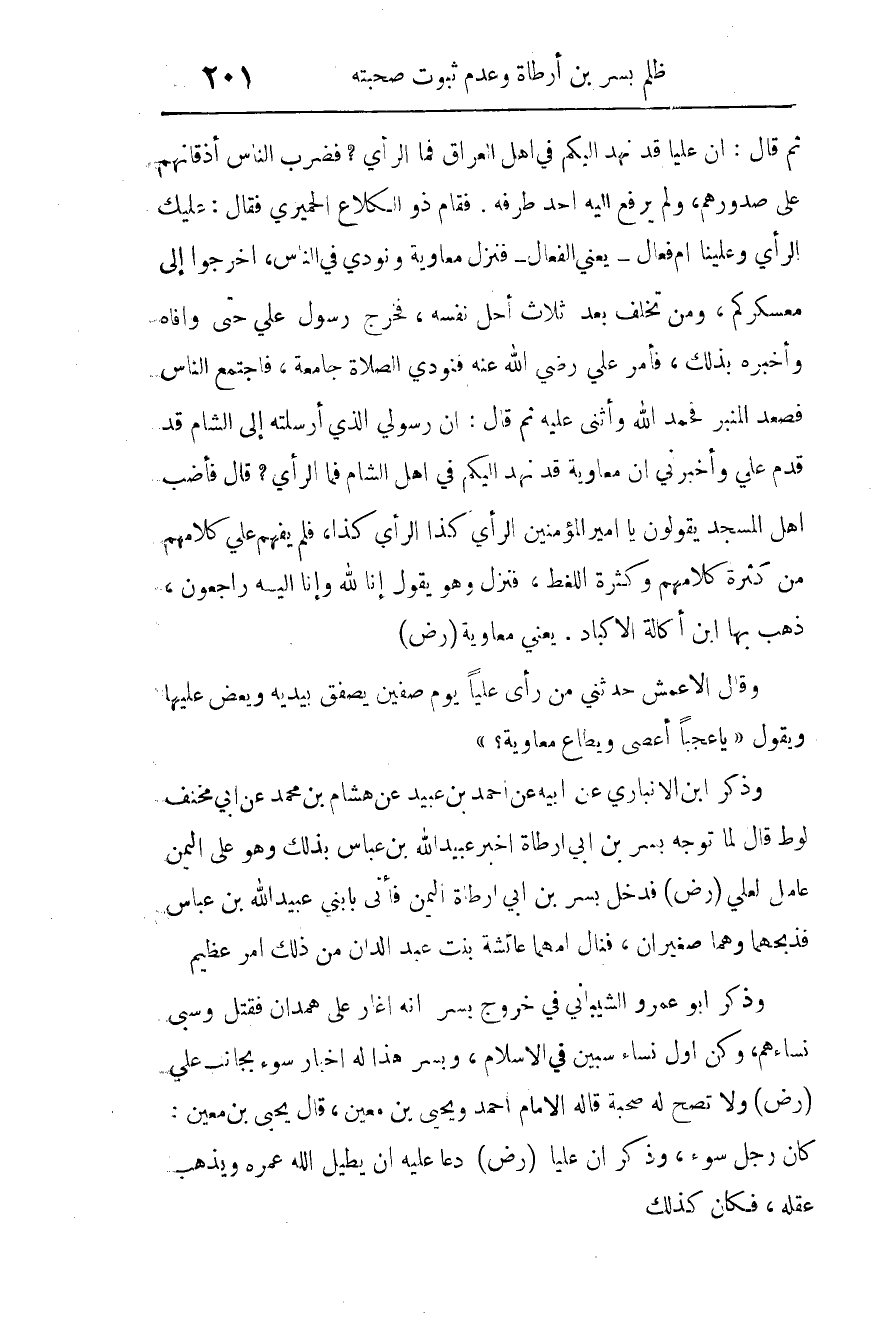 وذكر أبو عمرو الشيباني في خروج بسر أنه أغار على همدان، فقتل وسبى نساءهم، وكن أول نساء سبين في الإسلام، وبسر هذا له أخبار سوء بجانب علي رضي الله عنه ولا تصح له صحبة، قاله الإمام أحمد ويحيى بن معين، قال يحيى بن معين: كان رجل سوء، وذكر أن عليا رضي الله عنه دعا عليه أن يطيل الله عمره، ويذهب عقله، فكان كذلك.