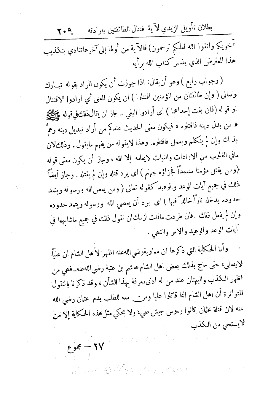 (وجواب رابع): وهو أن يقال: إذا جوَّزت أن يكون المراد بقوله -تبارك وتعالى-: {إِنْ طَائِفَتَانِ مِنَ الْمُؤْمِنِينَ اقْتَتَلُوا} 2 أن يكون المعنى أي: أرادوا الاقتتال، أو قوله: {فَإِنْ بَغَتْ إِحْدَاهُمَا عَلَى الأُخْرَى} 3 أي: أرادوا البغي؛ جاز أن يقال ذلك في قوله صلى الله عليه وسلم "من بدَّل دينه فاقتلوه" 4، فيكون معنى الحديث عندكم: مَنْ أراد تبديل دينه وَهَمَّ بذلك -وإن لم يتكلم ويعمل- فاقتلوه.