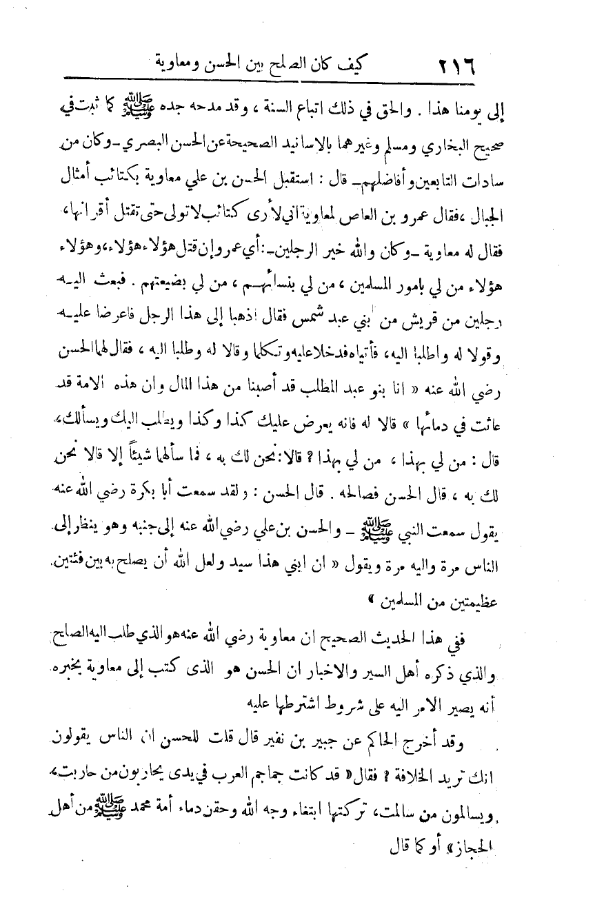 وقد أخرج الحاكم عن جبير بن نفير قال: قلت للحسن: إن الناس يقولون: إنك تريد الخلافة؟ فقال: "قد كانت جماجم العرب في يدي يحاربون من حاربت، ويسالمون من سالمت، تركتها ابتغاء وجه الله، وحقن دماء أمة محمد صلى الله عليه وسلم من أهل الحجاز". أو كما قال.