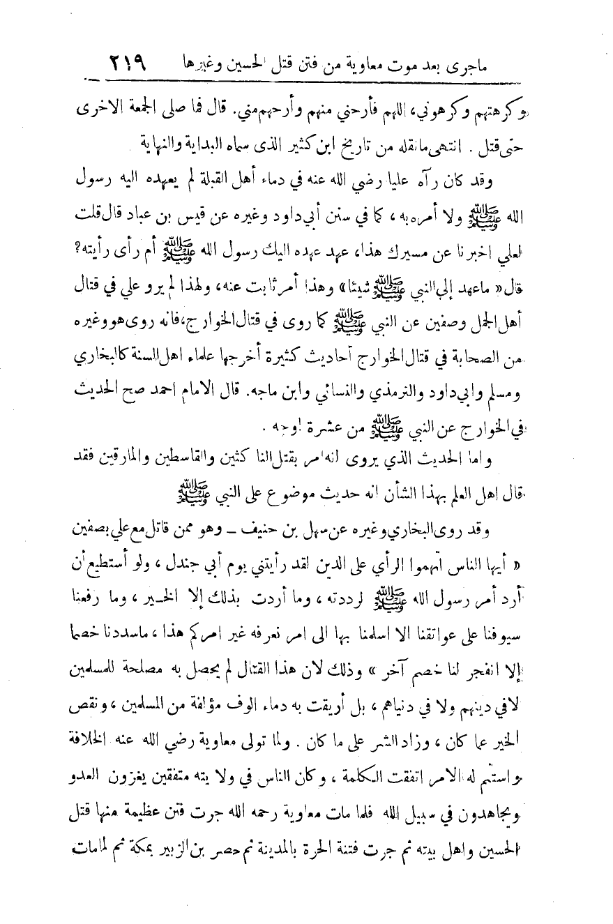 وقد روى البخاري وغيره عن سهل بن حنيف -وهو ممن قاتل مع علي بصفين-: "أيها الناس اتهموا الرأي على الدين، لقد رأيتني يوم أبي جندل، ولو أستطيع أن أرد أمر رسول الله صلى الله عليه وسلم لرددته، وما أردت بذلك إلا الخير، وما رفعنا سيوفنا على عواتقنا إلا أسلمنا بها إلى أمر نعرفه، غير أمركم هذا؛ ما سددنا خصما إلا انفجر لنا خصم آخر"2؛ وذلك لأن هذا القتال لم يحصل به مصلحة للمسلمين لا في دينهم ولا في دنياهم، بل أُريقت به دماء ألوف مؤلَّفة من المسلمين، ونقص الخير عما كان، وزاد الشر على ما كان، ولما تولى معاوية رضي الله عنه الخلافة واستتم له الأمر اتفقت الكلمة، وكان الناس في ولايته متفقين يغزون العدو، ويجاهدون في سبيل الله، فلما مات معاوية -رحمه الله- جرت فتن عظيمة منها قتل الحسين وأهل بيته، ثم جرت فتنة الحرة بالمدينة، ثم حصر ابن الزبير بمكة. ثم لما مات