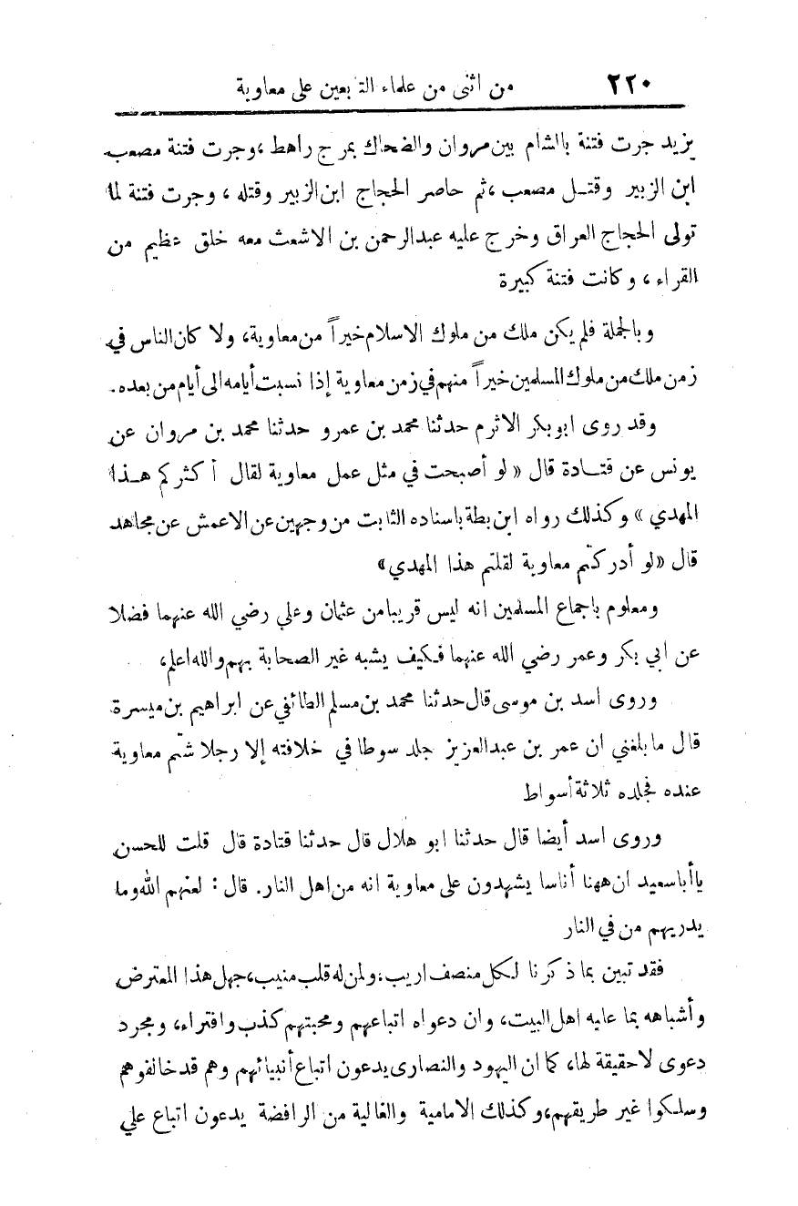 وبالجملة، فلم يكن ملك من ملوك الإسلام خيرا من معاوية، ولا كان الناس في زمن ملك من ملوك المسلمين خيرا منهم في زمن معاوية، إذا نسبت أيامه إلى أيام من بعده.