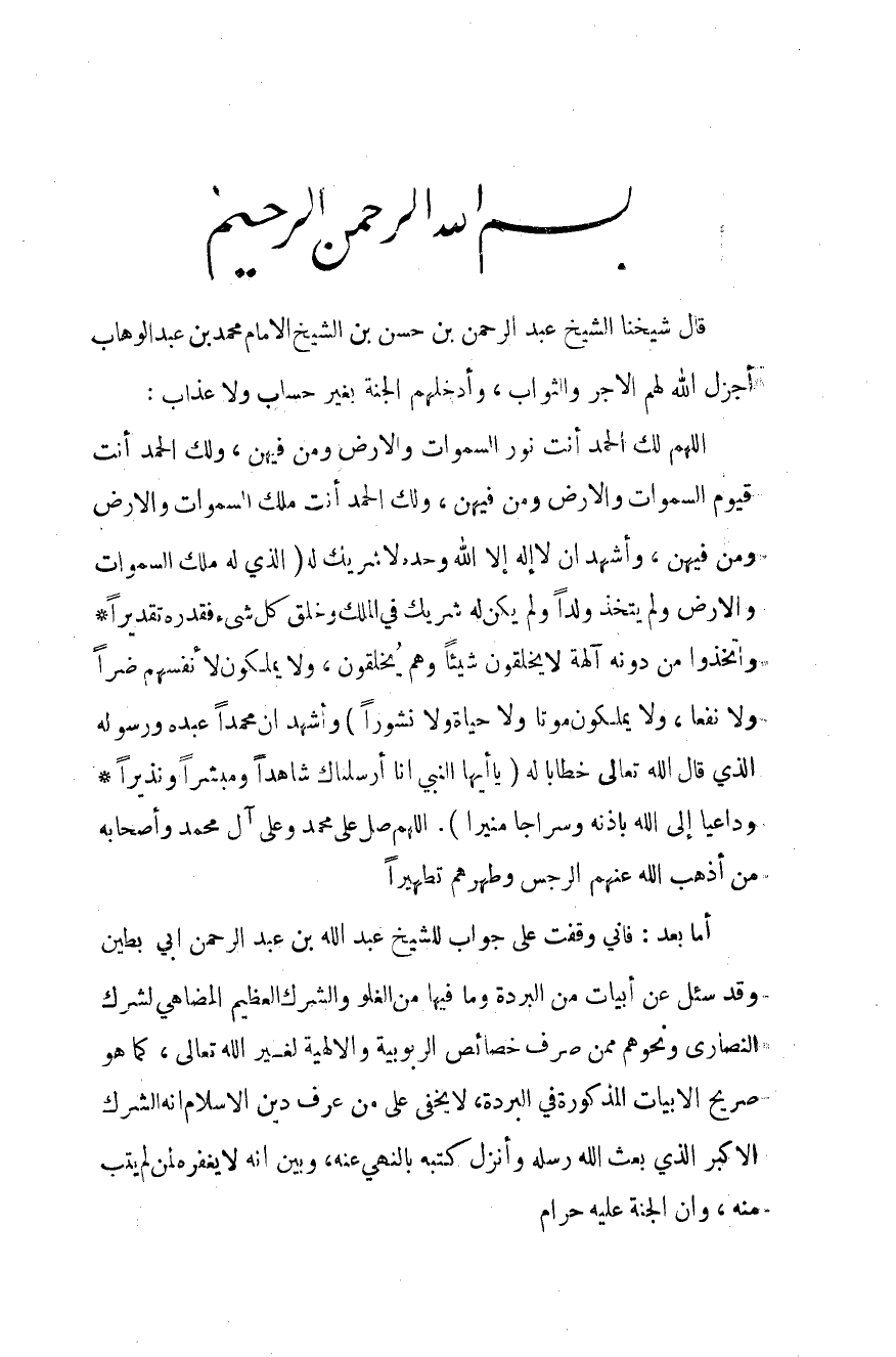 قال شيخنا الشيخ عبد الرحمن بن حسن بن الشيخ الإمام محمد بن عبد الوهاب، أجزل الله لهم الأجر والثواب، وأدخلهم الجنة بغير حساب ولا عذاب: