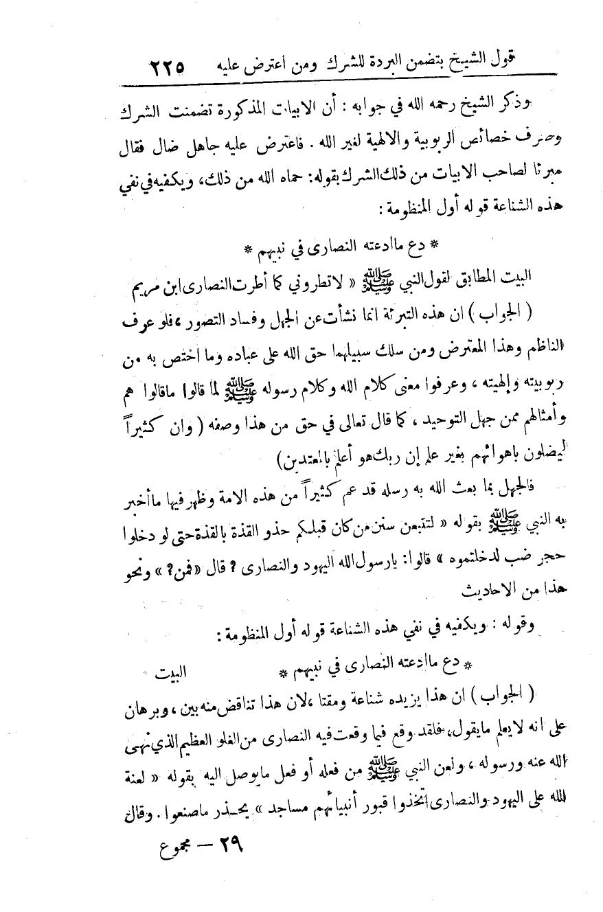 (الجواب): أن هذا يزيده شناعة ومقتا؛ لأن هذا تناقض منه بيِّن، وبرهان على أنه لا يعلم ما يقول، فلقد وقع فيما وقعت فيه النصارى من الغلو العظيم الذي نهى الله عنه ورسوله، ولعن النبي صلى الله عليه وسلم من فعله، أو فعل ما يوصل إليه بقوله: "لعنة الله على اليهود والنصارى، اتخذوا قبور أنبيائهم مساجد. يحذر ما صنعوا"4. وقال: