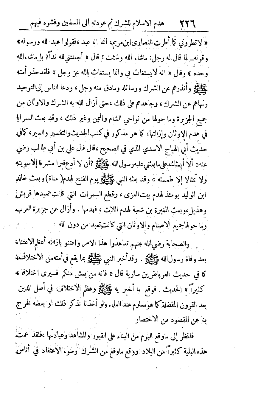 وقد بعث السرايا في هدم الأوثان وإزالتها، كما هو مذكور في كتب الحديث والتفسير والسير، كما في حديث أبي الهياج الأسدي الذي في الصحيح، قال: قال علي بن أبي طالب رضي الله عنه "ألا أبعثك على ما بعثني عليه رسول الله صلى الله عليه وسلم؟ أن لا أدع قبرا مشرفا إلا سويته، ولا تمثالا إلا طمسته"3. وقد بعثه النبي صلى الله عليه وسلم يوم الفتح لهدم (مناة) وبعث خالد بن الوليد يومئذ لهدم بيت العزى، وقطع السمرات التي كانت تعبدها قريش وهذيل، وبعث المغيرة بن شعبة لهدم اللات فهدمها، وأزال عن جزيرة العرب وما حولها جميع الأصنام والأوثان التي كانت تعبد من دون الله.