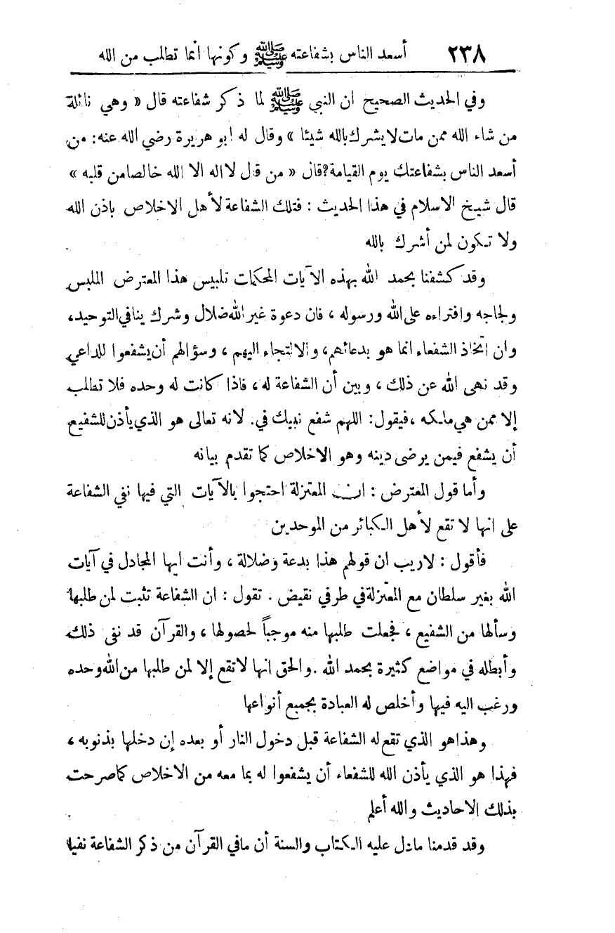 وفي الحديث الصحيح أن النبي صلى الله عليه وسلم لما ذكر شفاعته قال: "وهي نائلة من شاء الله ممن مات لا يشرك بالله شيئا". وقال له أبو هريرة رضي الله عنه: "من أسعد الناس بشفاعتك يوم القيامة؟ قال: من قال لا إله إلا الله خالصا من قلبه"1. قال شيخ الإسلام في هذا الحديث: "فتلك الشفاعة لأهل الإخلاص بإذن الله، ولا تكون لمن أشرك بالله".