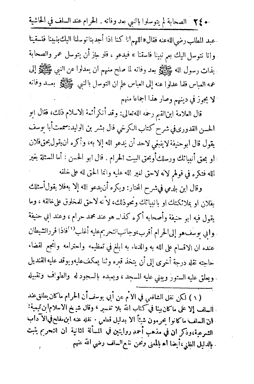 عبد المطلب رضي الله عنه فقال: "اللهم إنا كنا إذا أجدبنا توسلنا إليك بنبينا؛ فتسقينا، وإنا نتوسل إليك بعم نبينا فاسقنا"، فيدعو. فلو جاز أن يتوسل عمر والصحابة بذات رسول الله صلى الله عليه وسلم بعد وفاته، لما صلح منهم أن يعدلوا عن النبي صلى الله عليه وسلم إلى عمه العباس، فلما عدلوا عنه إلى العباس علم أن التوسل بالنبي صلى الله عليه وسلم بعد وفاته لا يجوز في دينهم، وصار هذا إجماعا منهم.
