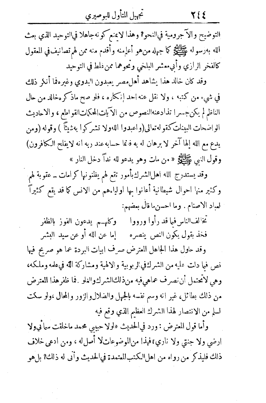 وقد كان خالد هذا يشاهد أهل مصر يعبدون البدوي وغيره فما أنكر ذلك في شيء من كتبه، ولا نقل عنه أحد إنكاره، فلو صحَّ ما ذكره خالد من حال الناظم لم يكن جسرا تذاد عنه النصوص من الآيات المحكمات القواطع، والأحاديث الواضحات البينات كقوله تعالى: {وَاعْبُدُوا اللَّهَ وَلا تُشْرِكُوا بِهِ شَيْئًا} 1 وقوله: {وَمَنْ يَدْعُ مَعَ اللَّهِ إِلَهًا آخَرَ لا بُرْهَانَ لَهُ بِهِ فَإِنَّمَا حِسَابُهُ عِنْدَ رَبِّهِ إِنَّهُ لا يُفْلِحُ الْكَافِرُونَ} 2، وقول النبي صلى الله عليه وسلم: "من مات وهو يدعو لله ندا، دخل النار"3.