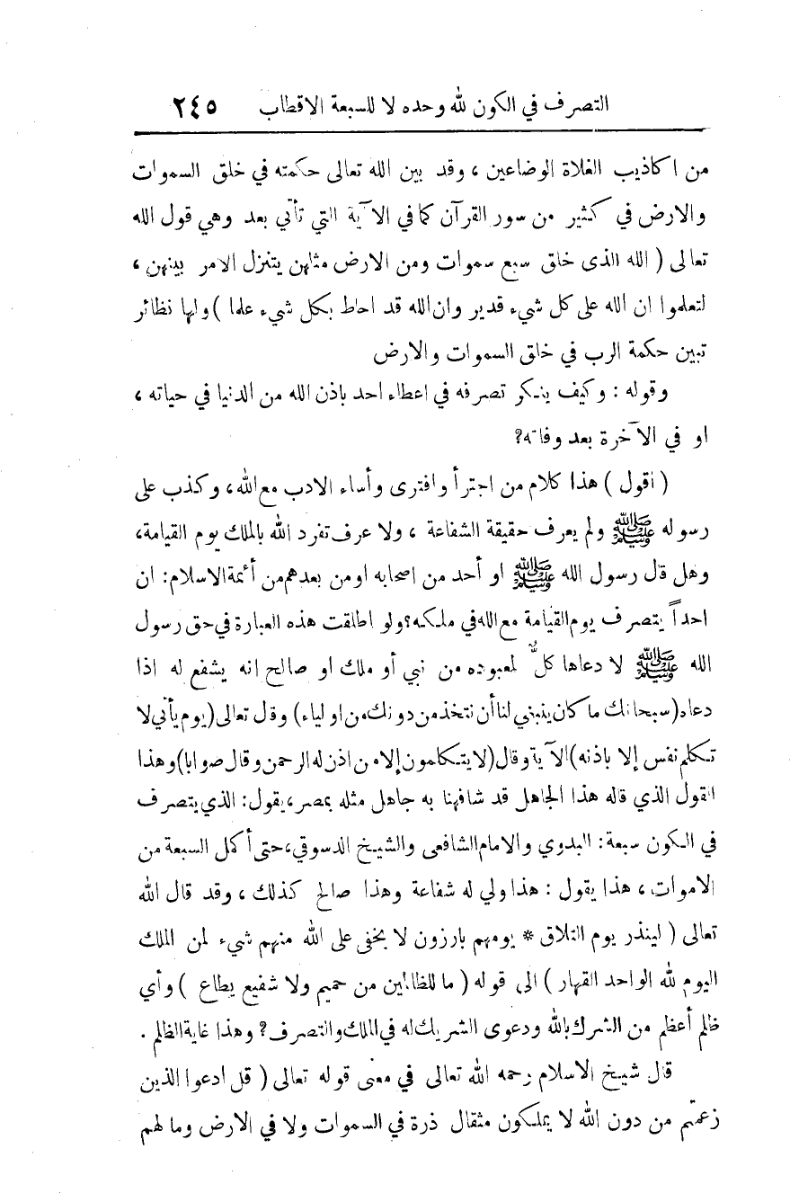 (أقول): هذا كلام من اجترأ وافترى وأساء الأدب مع الله، وكذب على رسوله صلى الله عليه وسلم ولم يعرف حقيقة الشفاعة، ولا عرف تفرُّد الله بالملك يوم القيامة. وهل قال رسول الله صلى الله عليه وسلم أو أحد من أصحابه أو من بعدهم من أئمة الإسلام: إن أحدا يتصرَّف يوم القيامة مع الله في ملكه؟ ولو أطلقت هذه العبارة في حق رسول الله صلى الله عليه وسلم لادَّعاها كلٌّ لمعبوده من نبي أو ملك أو صالح أنه يشفع له إذا دعاه. {سُبْحَانَكَ مَا كَانَ يَنْبَغِي لَنَا أَنْ نَتَّخِذَ مِنْ دُونِكَ مِنْ أَوْلِيَاءَ} 2، وقال تعالى: {يَوْمَ يَأْتِ لا تَكَلَّمُ نَفْسٌ إِلَّا بِإِذْنِهِ} 3 الآية، وقال: {لا يَتَكَلَّمُونَ إِلَّا مَنْ أَذِنَ لَهُ الرَّحْمَنُ وَقَالَ صَوَابًا} 4. وهذا القول الذي قاله هذا الجاهل قد شافهنا به جاهل مثله بمصر، يقول: الذي يتصرف في الكون سبعة: البدوي والإمام الشافعي والشيخ الدسوقي، حتى أكمل السبعة من الأموات، هذا يقول: هذا وليُّ له شفاعة، وهذا صالح كذلك، وقد قال الله تعالى: {لِيُنْذِرَ يَوْمَ التَّلاق يَوْمَ هُمْ بَارِزُونَ لا يَخْفَى عَلَى اللَّهِ مِنْهُمْ شَيْءٌ لِمَنِ الْمُلْكُ الْيَوْمَ لِلَّهِ الْوَاحِدِ الْقَهَّارِ} 5 إلى قوله: {مَا لِلظَّالِمِينَ مِنْ حَمِيمٍ وَلا شَفِيعٍ يُطَاعُ} 6. وأي ظلم أعظم من الشرك بالله، ودعوى الشريك له في الملك والتصرف؟ وهذا غاية الظلم.