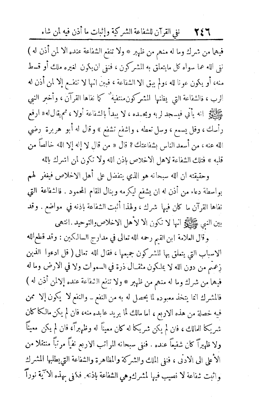 وقال العلامة ابن القيم -رحمه الله تعالى- في مدارج السالكين: "وقد قطع الله الأسباب التي يتعلق بها المشركون جميعها، فقال الله تعالى: {قُلِ ادْعُوا الَّذِينَ زَعَمْتُمْ مِنْ دُونِ اللَّهِ لا يَمْلِكُونَ مِثْقَالَ ذَرَّةٍ فِي السَّمَاوَاتِ وَلا فِي الأَرْضِ وَمَا لَهُمْ فِيهِمَا مِنْ شِرْكٍ وَمَا لَهُ مِنْهُمْ مِنْ ظَهِيرٍ وَلا تَنْفَعُ الشَّفَاعَةُ عِنْدَهُ إِلَّا لِمَنْ أَذِنَ} 4. فالمشرك إنما يتخذ معبوده لما يحصل له به من النفع، والنفع لا يكون إلا ممن فيه خصلة من هذه الأربع: إما مالك لما يريد عابده منه، فإن لم يكن مالكا كان شريكا للمالك، فإن لم يكن شريكا له كان معينا له وظهيرا، فإن لم يكن معينا ولا ظهيرا كان شفيعا عنده، فنفى -سبحانه- المراتب الأربع نفيا مرتبا منتقلا من الأعلى إلى الأدنى، فنفى الملك والشركة والمظاهرة والشفاعة التي يطلبها المشرك، وأثبت شفاعة لا نصيب فيها لمشرك، وهي الشفاعة بإذنه. فكفى بهذه الآية نورًا