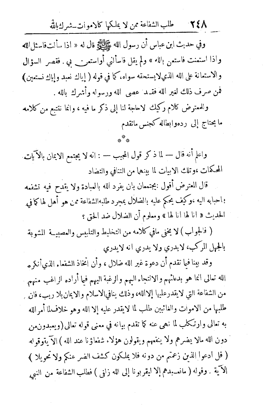 وقد بينا فيها تقدم أن دعوة غير الله ضلال، وأن اتخاذ الشفعاء الذي أنكره الله تعالى إنما هو بدعائهم والالتجاء إليهم والرغبة إليهم فيما أراده الراغب منهم من الشفاعة التي لا يقدر عليها إلا الله، وذلك ينافي الإسلام والإيمان بلا ريب؛ فإن طلبها من الأموات والغائبين طلب لما لا يقدر عليه إلا الله، وهو خلاف لما أمر الله به تعالى، وارتكاب لما نهى عنه كما تقدم بيانه في معنى قوله تعالى: {وَيَعْبُدُونَ مِنْ دُونِ اللَّهِ مَا لا يَضُرُّهُمْ وَلا يَنْفَعُهُمْ وَيَقُولُونَ هَؤُلاءِ شُفَعَاؤُنَا عِنْدَ اللَّهِ} 4 الآية، وقوله: {قُلِ ادْعُوا الَّذِينَ زَعَمْتُمْ مِنْ دُونِهِ فَلا يَمْلِكُونَ كَشْفَ الضُّرِّ عَنْكُمْ وَلا تَحْوِيلًا} 5 الآية، وقوله: {مَا نَعْبُدُهُمْ إِلَّا لِيُقَرِّبُونَا إِلَى اللَّهِ زُلْفَى} 6. فطلب الشفاعة من النبي