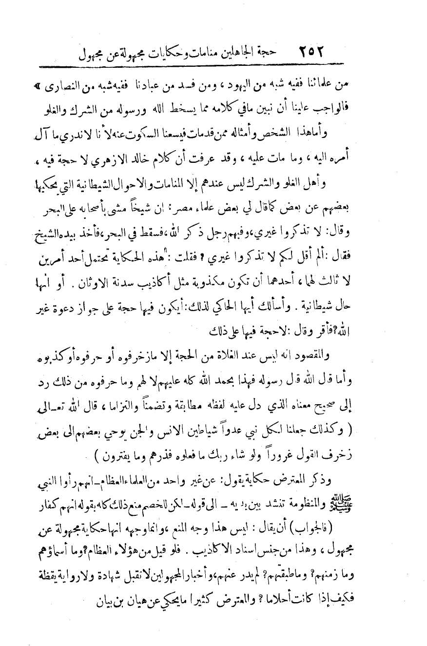 فقلت: هذه الحكاية تحتمل أحد أمرين لا ثالث لهما: أحدهما: أن تكون مكذوبة مثل أكاذيب سَدَنة الأوثان. أو أنها حال شيطانية. وأسألك أيها الحاكي لذلك: أيكون فيها حجة على جواز دعوة غير الله؟ فأقَرَّ، وقال: لا حجة فيها على ذلك.