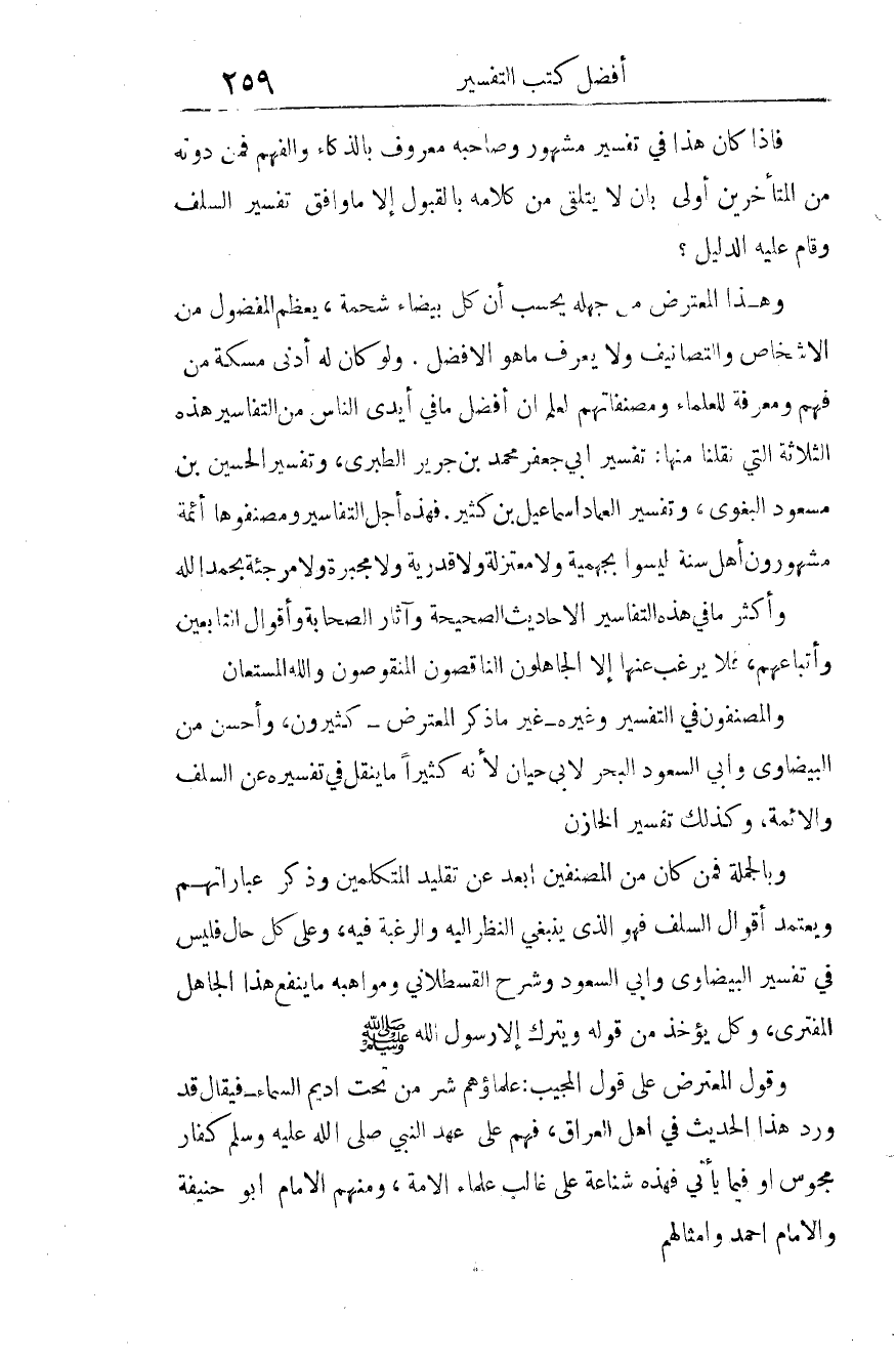 وهذا المعترض من جهله يحسب أن كل بيضاء شحمة، يُعَظِّم المفضولَ من الأشخاص والتصانيف، ولا يعرف ما هو الأفضل. ولو كان له أدنى مِسْكَة من فهم، ومعرفة للعلماء ومصنفاتهم: لعلم أن أفضل ما في أيدي الناس من التفاسير هذه الثلاثة التي نقلنا منها: تفسير أبي جعفر محمد بن جرير الطبري، وتفسير الحسين بن مسعود البغوي، وتفسير العماد إسماعيل بن كثير.