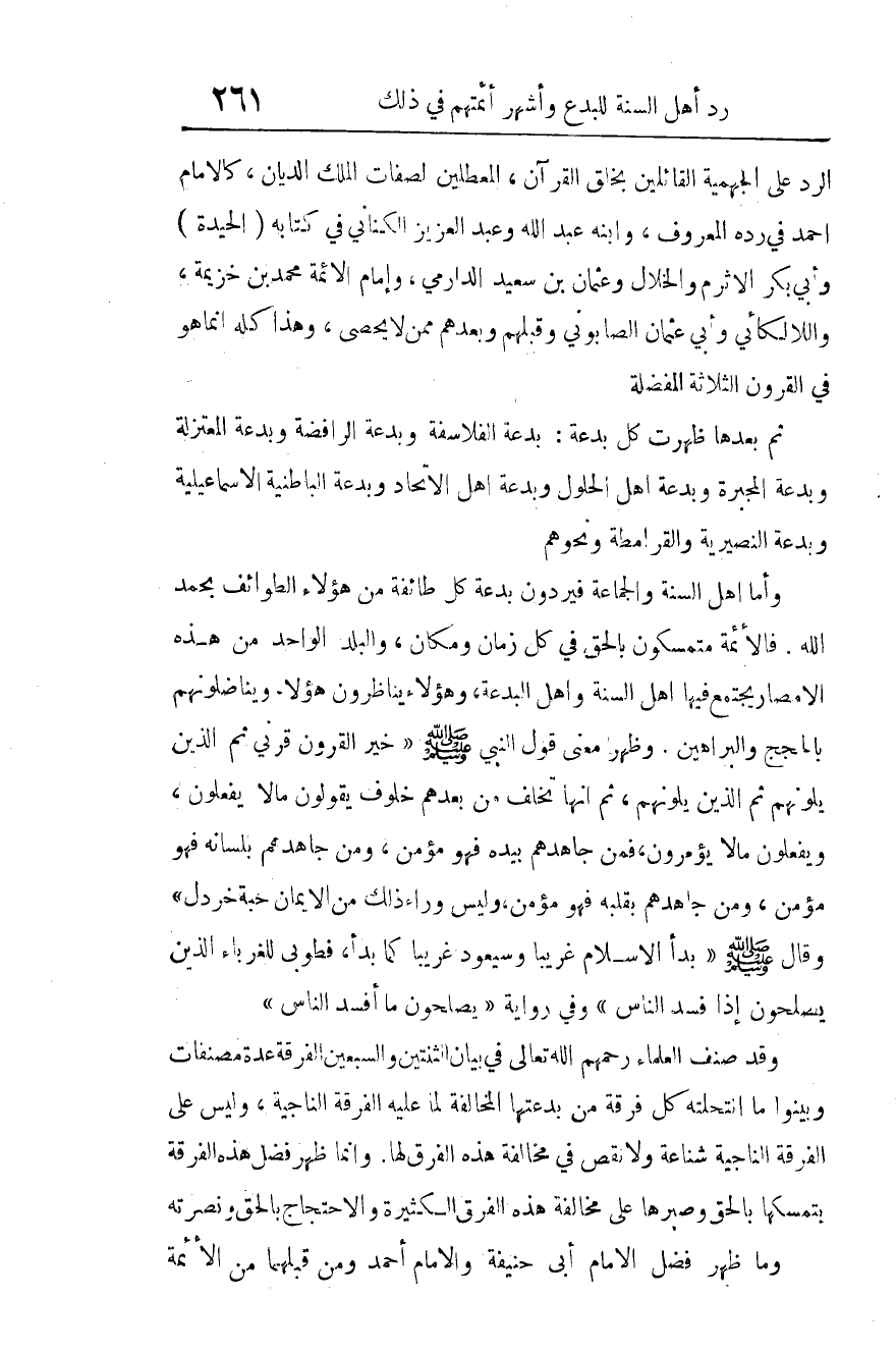 وأما أهل السنة والجماعة فيردون بدعة كل طائفة من هؤلاء الطوائف بحمد الله. فالأئمة متمسكون بالحق في كل زمان ومكان، والبلد الواحد من هذه الأمصار يجتمع فيها أهل السنة وأهل البدعة، وهؤلاء يناظرون هؤلاء ويُنَاضِلُونَهُم بالحُجَج والبراهين، وظهر معنى قول النبي صلى الله عليه وسلم: "خير القرون قرني، ثم الذين يلونهم، ثم الذين يلونهم، ثم إنها تَخْلُفُ من بعدهم خُلُوفٌ يقولون ما لا يفعلون، ويفعلون ما لا يؤمرون، فمن جاهدهم بيده فهو مؤمن، ومن جاهدهم بلسانه فهو مؤمن، ومن جاهدهم بقلبه فهو مؤمن، وليس وراء ذلك من الإيمان حبة خردل"1. وقال صلى الله عليه وسلم: "بدأ الإسلام غريبا وسيعود غريبا كما بدأ فطوبى للغرباء الذين يَصْلُحُونَ إذا فسد الناس"2، وفي رواية "يُصْلِحُونَ ما أفسد الناس"3.