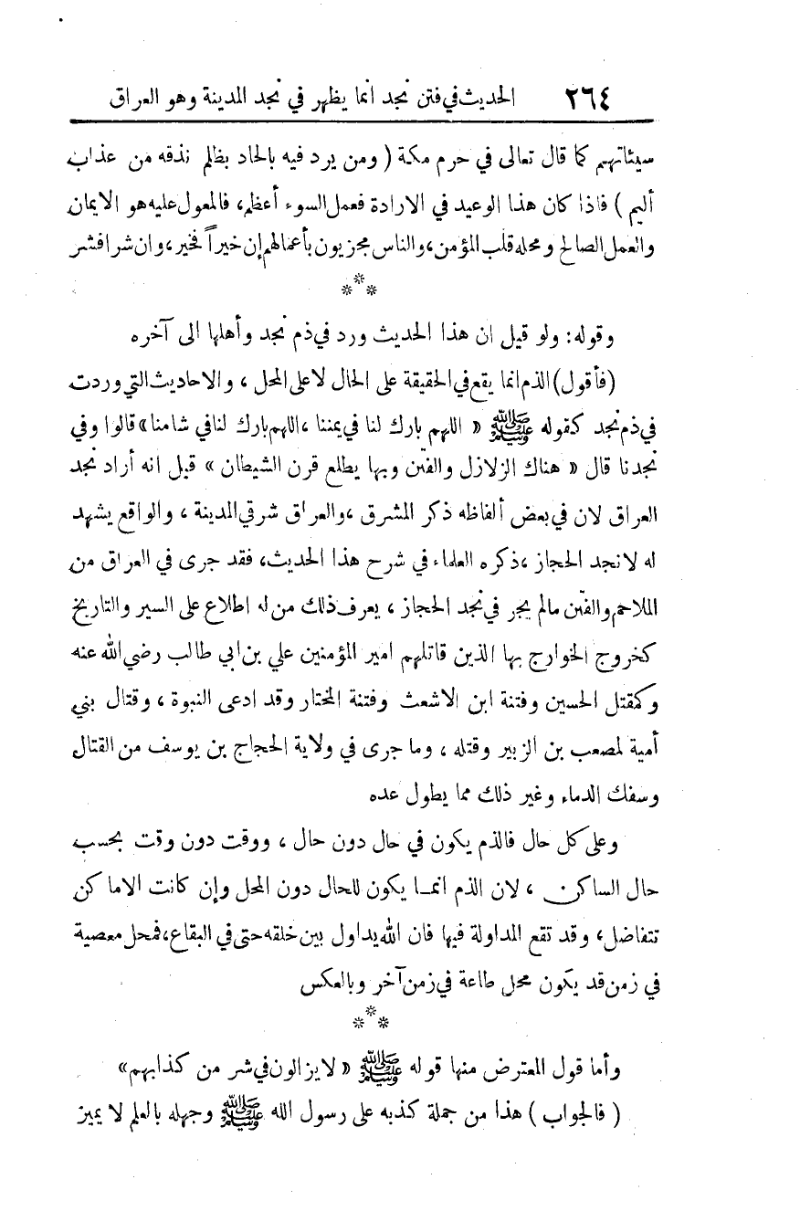 (فأقول): الذم إنما يقع في الحقيقة على الحال لا على المحل، والأحاديث التي وردت في ذم نجد، كقوله صلى الله عليه وسلم "اللهم بارك لنا في يَمَنِنَا، اللهم بارك لنا في شامنا" 2 قالوا: وفي نجدنا، قال: "هناك الزلازل والفتن، وبها يطلع قرن الشيطان" 3 قيل: إنه أراد نجد العراق؛ لأن في بعض ألفاظه ذكر المشرق، والعراق شرقي المدينة، والواقع يشهد له، لا نَجْدَ الحجازِ، ذكره العلماء في شرح هذا الحديث. فقد جرى في العراق من الملاحم والفتن ما لم يَجْرِ في نجد الحجاز، يعرف ذلك مَنْ له اطلاع على السير والتاريخ، كخروج الخوارج بها، الذين قاتلهم أمير المؤمنين علي بن أبي طالب رضي الله عنه، وكمقتل الحسين، وفتنة ابن الأشعث، وفتنة المختار وقد ادعى النبوة، وقتال بني أمية لمصعب بن الزبير وقتله، وما جرى في ولاية الحجاج بن يوسف من القتال وسفك الدماء وغير ذلك مما يطول عده.