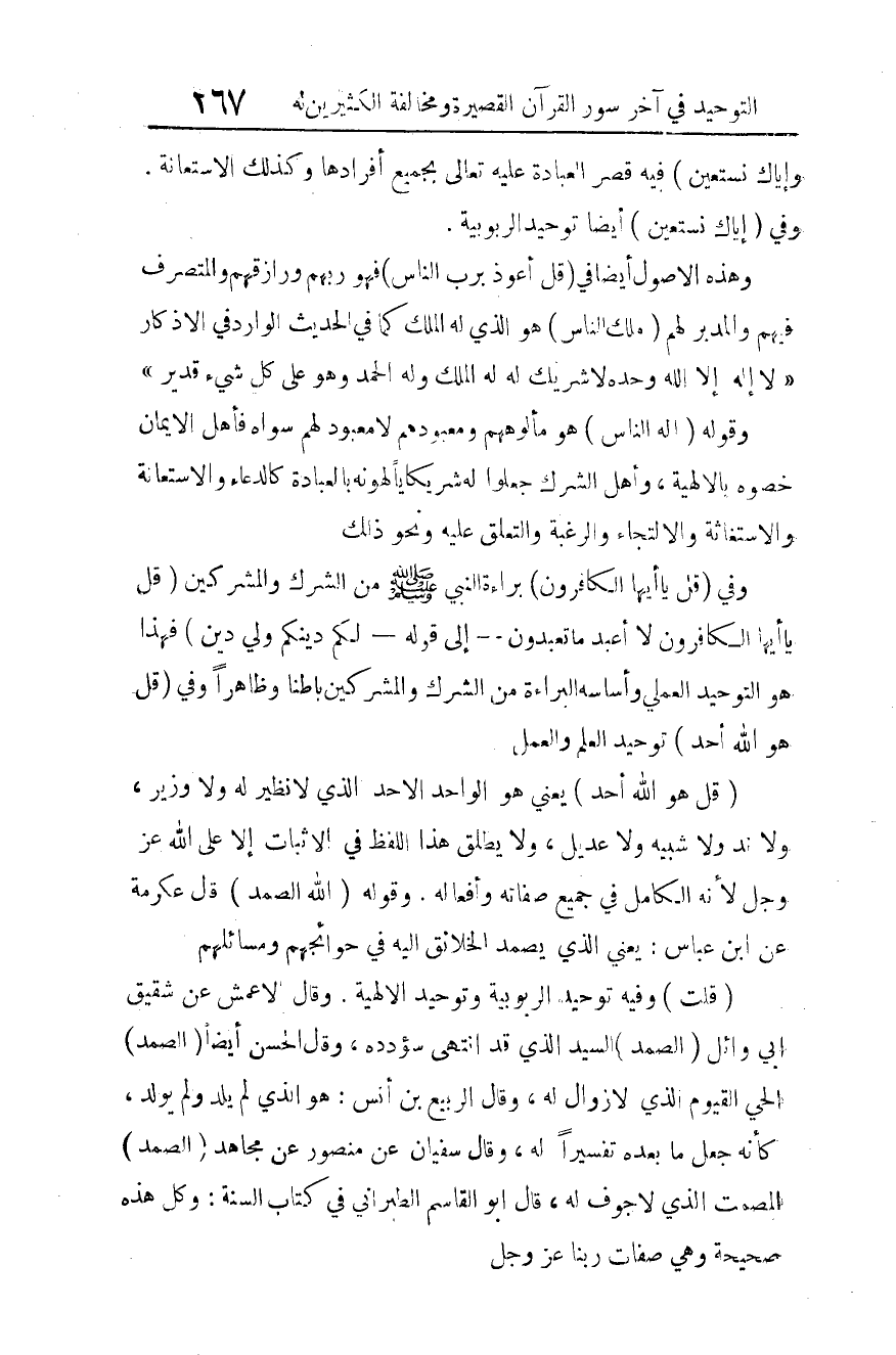 وفي: {قُلْ يَا أَيُّهَا الْكَافِرُونَ} 7 براءة النبي صلى الله عليه وسلم من الشرك والمشركين. {قُلْ يَا أَيُّهَا الْكَافِرُونَ لا أَعْبُدُ مَا تَعْبُدُونَ} 8 إلى قوله: {لَكُمْ دِينُكُمْ وَلِيَ دِينِ} 9 فهذا هو التوحيد العملي، وأساسه البراءة من الشرك والمشركين باطنا وظاهرا، وفي {قُلْ هُوَ اللَّهُ أَحَدٌ} 10 توحيد العلم والعمل.