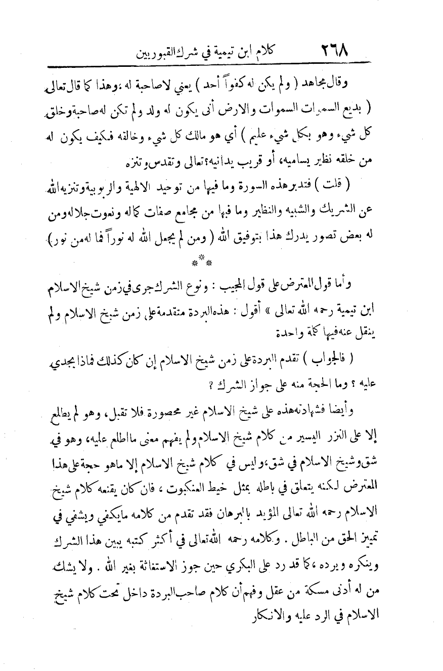 (فالجواب): تقدُّم البردة على زمن شيخ الإسلام إن كان كذلك فماذا يُجْدِي عليه؟ وما الحجة منه على جواز الشرك؟ وأيضا فشهادته هذه على شيخ الإسلام غيرُ محصورة، فلا تُقْبل. وهو لم يطلع إلا على النّزر اليسير من كلام شيخ الإسلام، ولم يفهم معنى ما اطلع عليه، وهو في شِقٍّ، وشيخ الإسلام في شِقٍّ، وليس في كلام شيخ الإسلام إلا ما هو حجة على هذا المعترض، لكنه يتعلق في باطله بمثل خيط العنكبوت، فإن كان يقنعه كلام شيخ الإسلام -رحمه الله تعالى- المُؤَيَّد بالبرهان، فقد تقدم من كلامه ما يكفي ويشفي في تمييز الحق من الباطل.