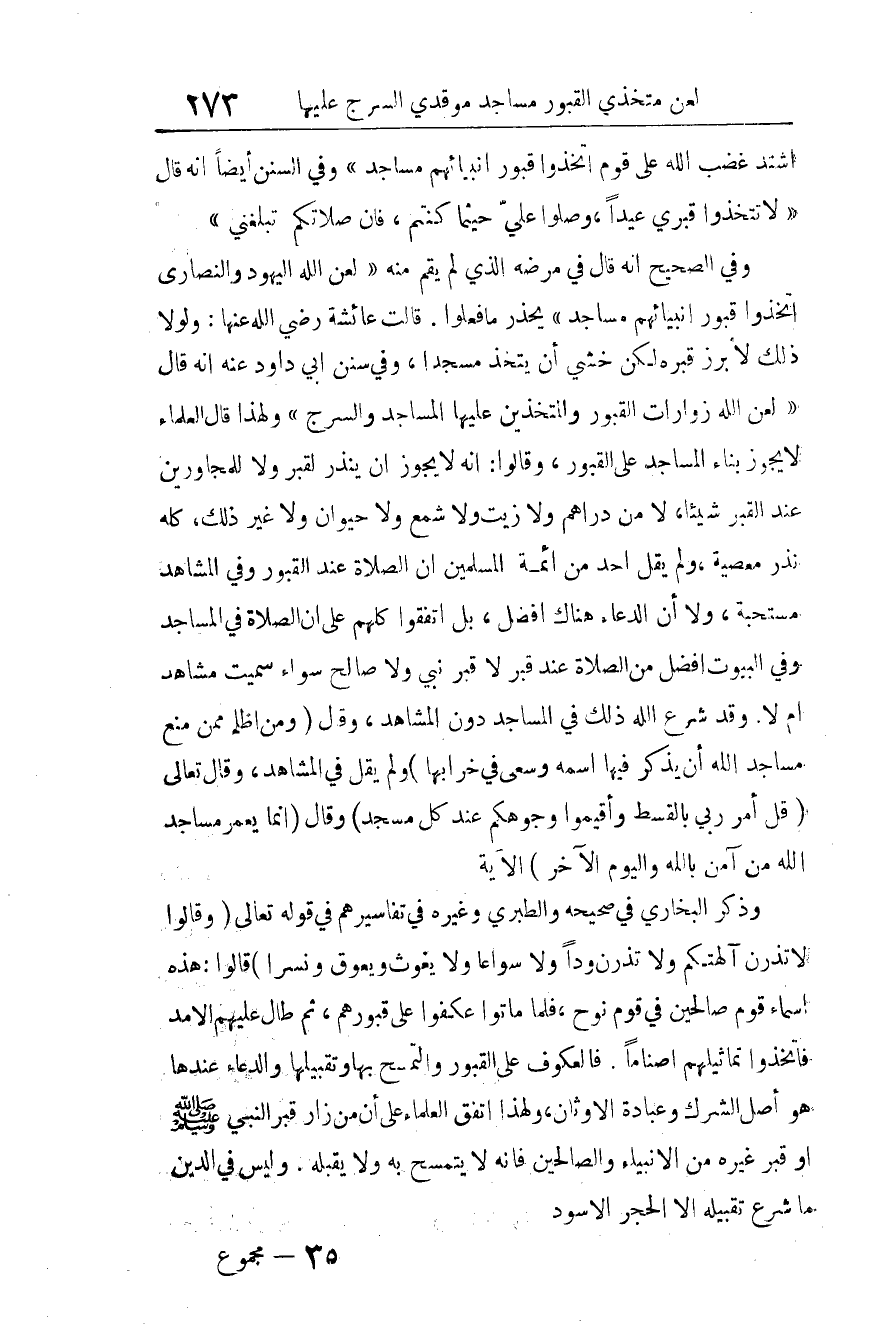وذكر البخاري في صحيحه والطبري وغيره في تفاسيرهم في قوله تعالى: {وَقَالُوا لا تَذَرُنَّ آلِهَتَكُمْ وَلا تَذَرُنَّ وَدًّا وَلا سُوَاعًا وَلا يَغُوثَ وَيَعُوقَ وَنَسْرًا} 8، قالوا: هذه أسماء قوم صالحين في قوم نوح، فلما ماتوا عكفوا على قبورهم، ثم طال عليهم الأمد فاتخذوا تماثيلهم أصناما. فالعكوف على القبور، والتمسح بها، وتقبيلها، والدعاء عندها هو أصل الشرك، وعبادة الأوثان، ولهذا اتفق العلماء على أنَّ من زار قبر النبي صلى الله عليه وسلم أو قبر غيره من الأنبياء والصالحين؛ فإنه لا يَتَمَسَّح به ولا يقبِّله. وليس في الدين ما شُرِعَ تقبيلُهُ إلا الحجر الأسود