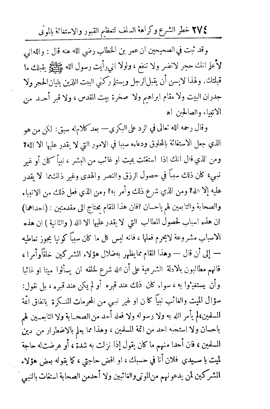 وهذا مما يعلم بالاضطرار من دين المسلمين، فإن أحدا منهم ما كان يقول -إذا نزلت به شدة، أو عرضت له حاجة لميت-: يا سيدي فلان أنا في حسبك، أو اقض حاجتي، كما يقوله بعض هؤلاء المشركين لمن يدعونهم من الموتى والغائبين. ولا أحد من الصحابة استغاث بالنبي