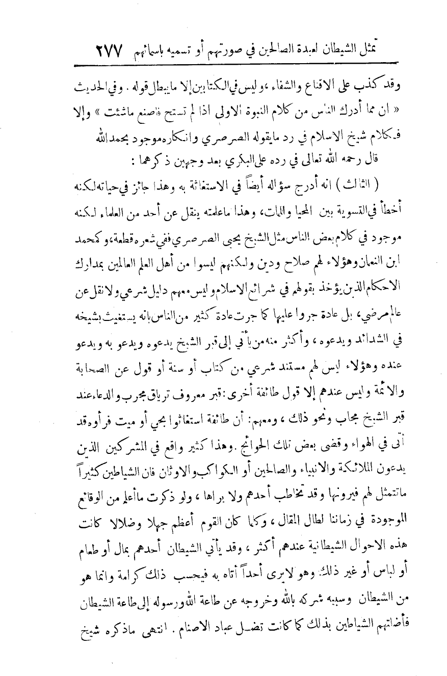 (الثالث): أنه أدرج سؤاله أيضا في الاستغاثة به، وهذا جائز في حياته، لكنه أخطأ في التسوية بين المحيا والممات، وهذا ما عَلِمْتُهُ يُنْقَلُ عن أحد من العلماء، لكنه موجود في كلام بعض الناس مثل الشيخ يحيى الصرصري ففي شعره قطعة، وكمحمد بن النعمان؛ وهؤلاء لهم صلاح ودين، ولكنهم ليسوا من أهل العلم العالمين بمدارك الأحكام الذين يؤخذ بقولهم في شرائع الإسلام، وليس معهم دليل شرعي، ولا نقل عن عالم مَرْضِي، بل عادة جَرَوْا عليها كما جرت عادة كثير من الناس بأنه يستغيث بشيخه في الشدائد ويدعوه.