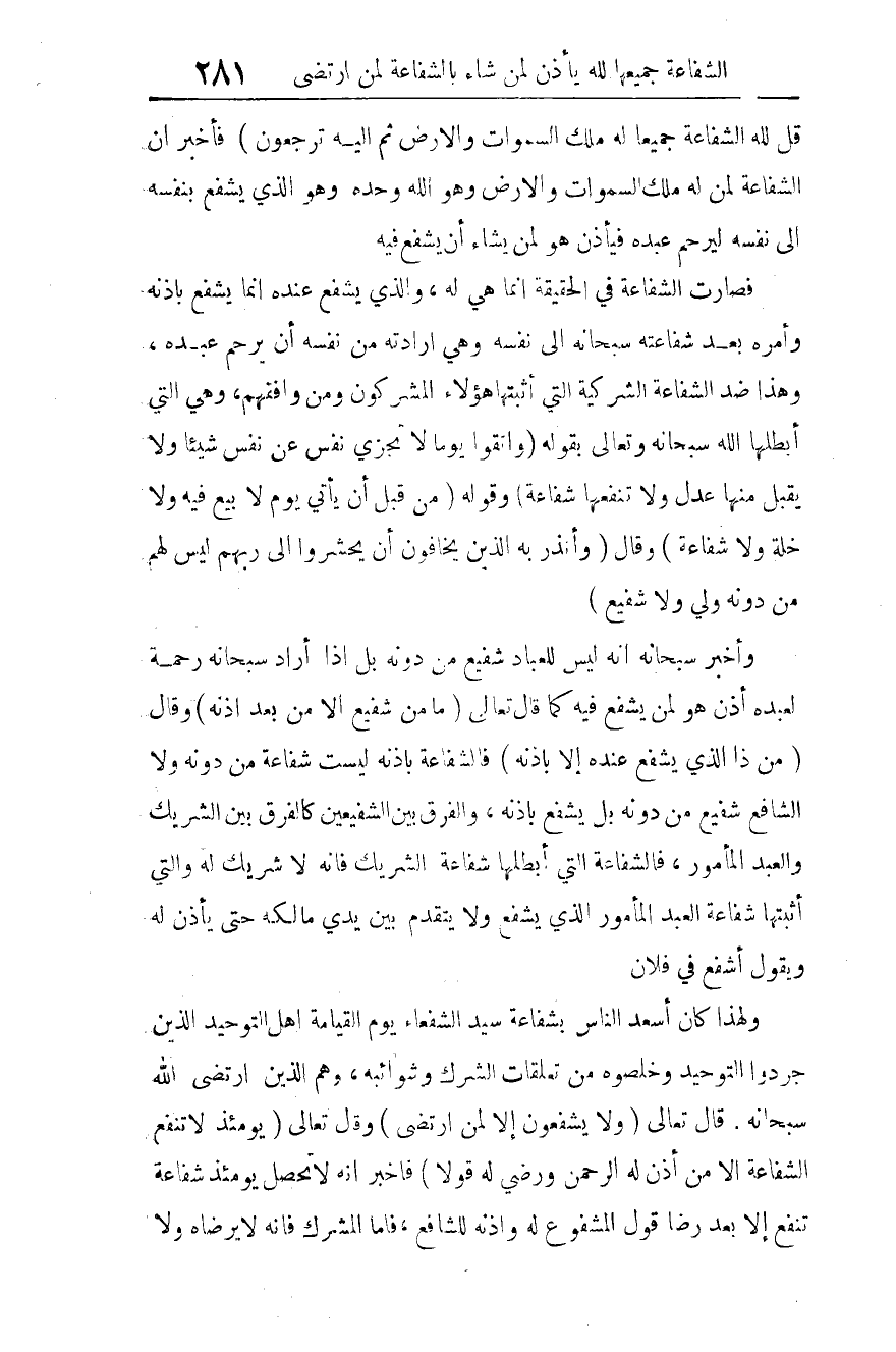 قُلْ لِلَّهِ الشَّفَاعَةُ جَمِيعًا لَهُ مُلْكُ السَّمَاوَاتِ وَالأَرْضِ ثُمَّ إِلَيْهِ تُرْجَعُونَ} 1 فأخبر أن الشفاعة لمن له ملك السماوات والأرض، وهو الله وحده، وهو الذي يشفع بنفسه إلى نفسه؛ ليرحم عبده، فيأذن هو لمن يشاء أن يشفع فيه؛ فصارت الشفاعة في الحقيقة إنما هي له. والذي يشفع عنده إنما يشفع بإذنه وأمره، بعد شفاعته -سبحانه- إلى نفسه، وهي إرادته من نفسه أن يرحم عبده.