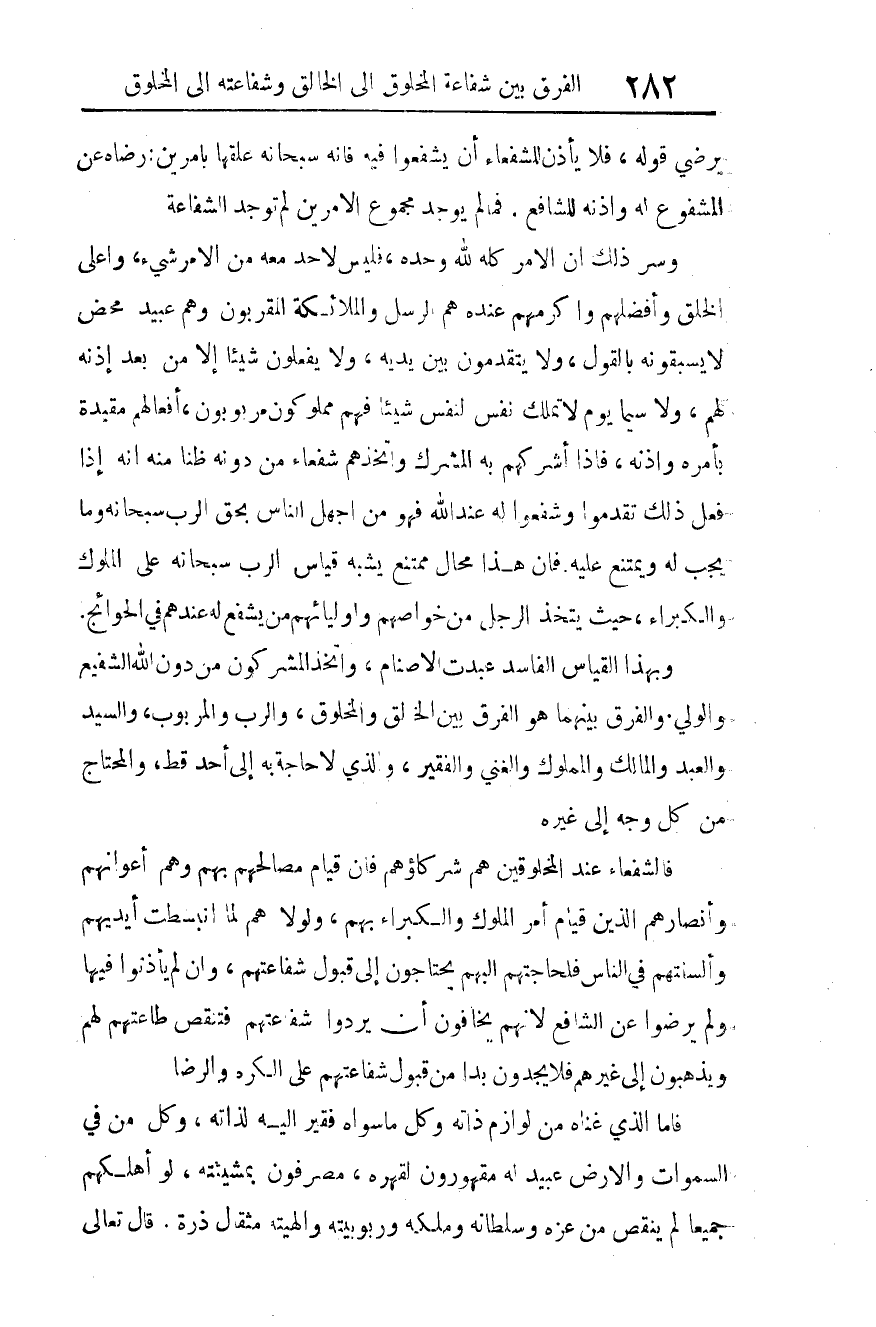 وبهذا القياس الفاسد عُبِدَتْ الأصنام، واتخذ المشركون من دون الله الشفيع والولي. والفرق بينهما هو الفرق بين الخالق والمخلوق، والرب والمربوب، والسيد والعبد، والمالك والمملوك، والغني والفقير، والذي لا حاجة به إلى أحد قط، والمحتاج من كل وجه إلى غيره.