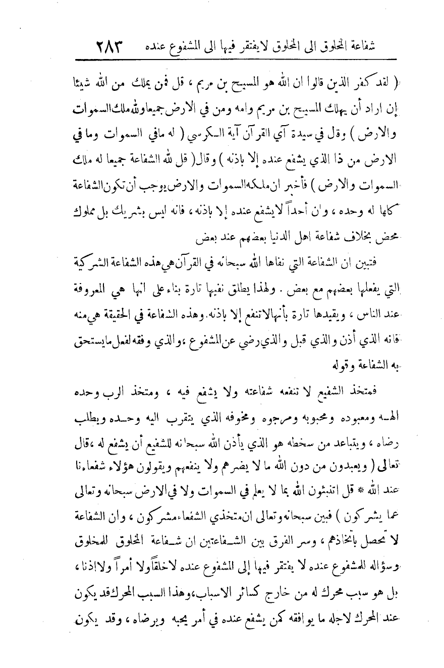 {لَقَدْ كَفَرَ الَّذِينَ قَالُوا إِنَّ اللَّهَ هُوَ الْمَسِيحُ ابْنُ مَرْيَمَ قُلْ فَمَنْ يَمْلِكُ مِنَ اللَّهِ شَيْئًا إِنْ أَرَادَ أَنْ يُهْلِكَ الْمَسِيحَ ابْنَ مَرْيَمَ وَأُمَّهُ وَمَنْ فِي الأَرْضِ جَمِيعًا} 1؛ وقال في -سيدة آي القرآن- آية الكرسي: {لَهُ مَا فِي السَّمَاوَاتِ وَمَا فِي الأَرْضِ مَنْ ذَا الَّذِي يَشْفَعُ عِنْدَهُ إِلَّا بِإِذْنِهِ} 2 وقال: {قُلْ لِلَّهِ الشَّفَاعَةُ جَمِيعًا لَهُ مُلْكُ السَّمَاوَاتِ وَالأَرْضِ} 3، فأخبر أن مُلْكَهُ السماواتِ والأرضَ يُوجِبُ أن تكون الشفاعة كلها له وحده، وأن أحدا لا يشفع عنده إلا بإذنه، فإنه ليس بشريك، بل مملوك محضٌ، بخلاف شفاعة أهل الدنيا بعضهم عند بعض.