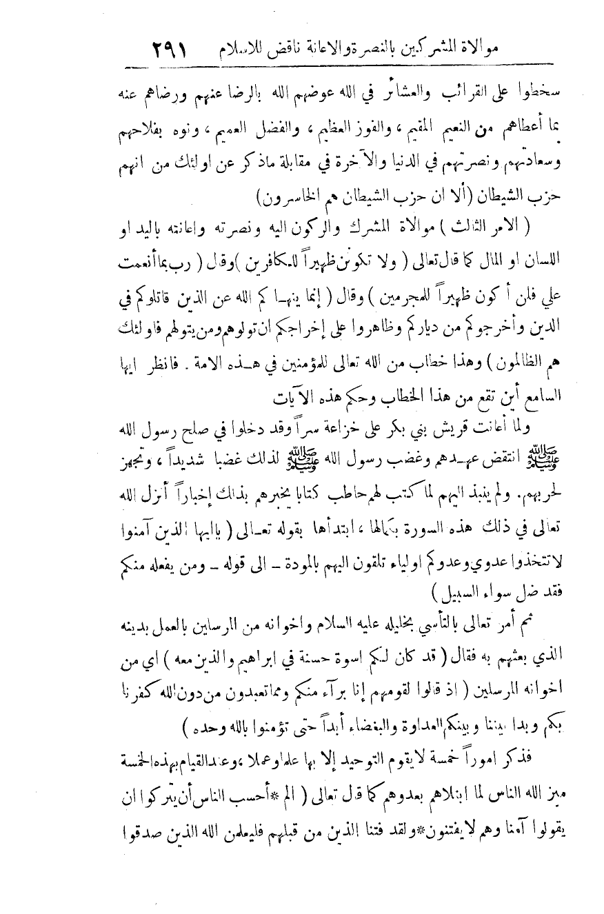 (الأمر الثالث): موالاة المشرك، والركون إليه، ونصرته وإعانته باليد، أو اللسان، أو المال كما قال تعالى: {فَلا تَكُونَنَّ ظَهِيرًا لِلْكَافِرِينَ} 2. وقال: {رَبِّ بِمَا أَنْعَمْتَ عَلَيَّ فَلَنْ أَكُونَ ظَهِيرًا لِلْمُجْرِمِينَ} 3. وقال: {إِنَّمَا يَنْهَاكُمُ اللَّهُ عَنِ الَّذِينَ قَاتَلُوكُمْ فِي الدِّينِ وَأَخْرَجُوكُمْ مِنْ دِيَارِكُمْ وَظَاهَرُوا عَلَى إِخْرَاجِكُمْ أَنْ تَوَلَّوْهُمْ وَمَنْ يَتَوَلَّهُمْ فَأُولَئِكَ هُمُ الظَّالِمُونَ} 4. وهذا خطاب من الله -تعالى- للمؤمنين في هذه الأمة؛ فانظر أيها السامع أين تقع من هذا الخطاب وحكم هذه الآيات.