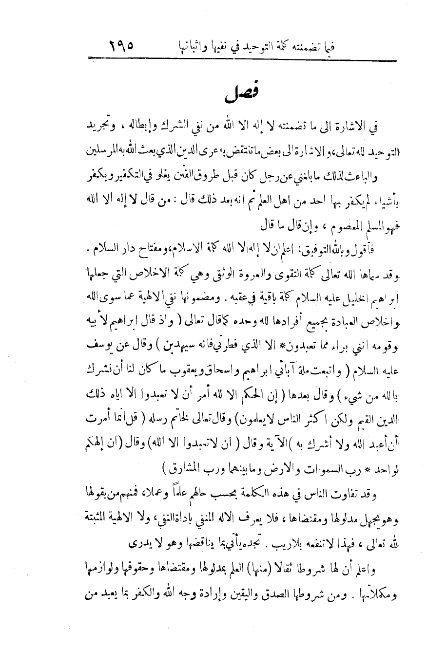 في الإشارة إلى ما تضمنَتْهُ لا إله إلا الله من نَفْيِ الشرك وإبطاله، وتجريد التوحيد لله تعالى والإشارة إلى بعض ما تُنْتَقَضُ به عُرَى الدين الذي بعث الله به المرسلين.