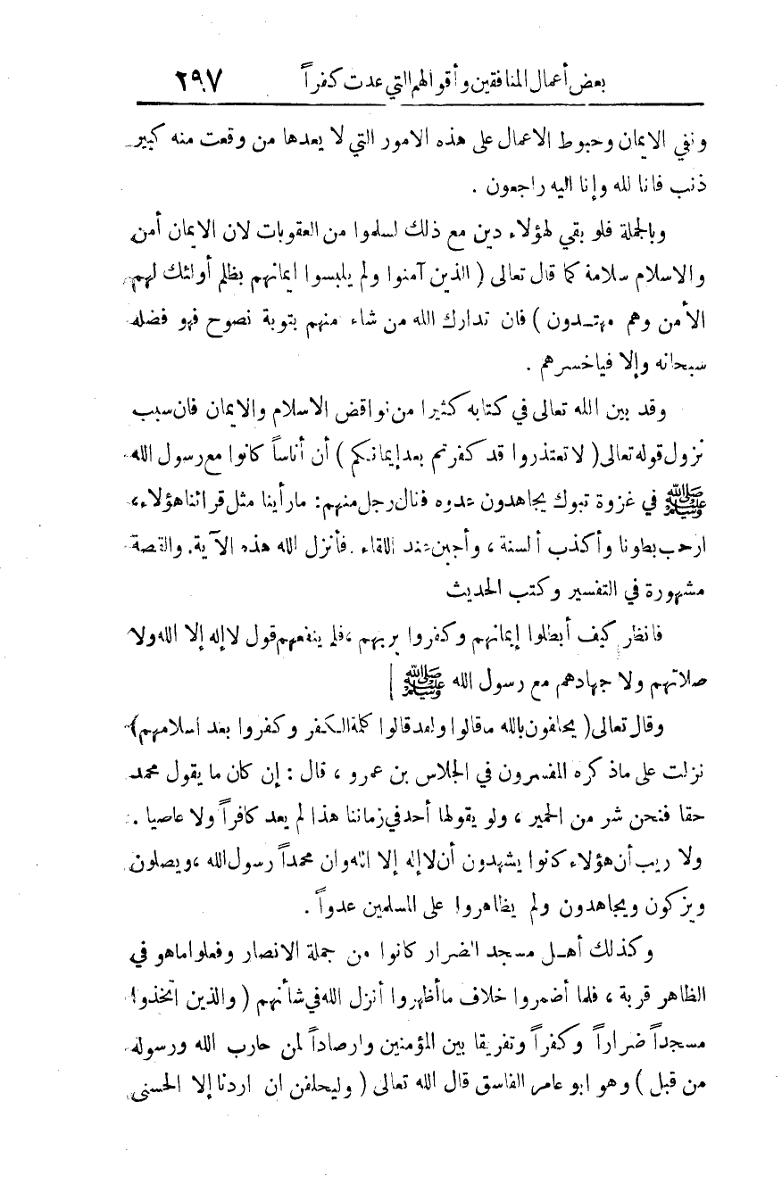 وقال تعالى: {يَحْلِفُونَ بِاللَّهِ مَا قَالُوا وَلَقَدْ قَالُوا كَلِمَةَ الْكُفْرِ وَكَفَرُوا بَعْدَ إِسْلامِهِمْ} 3 نزلت -على ما ذكره المفسرون- في الجلاس بن عمرو، قال: إن كان ما يقول محمدٌ حَقًّا فنحن شر من الحمير، ولو يقولها أحد في زماننا هذا لم يعد كافرا ولا عاصيا. ولا ريب أن هؤلاء كانوا يشهدون أن لا إله إلا الله، وأن محمدا رسول الله، ويصلون ويزكون ويجاهدون، ولم يُظَاهِرُوا على المسلمين عدوا.