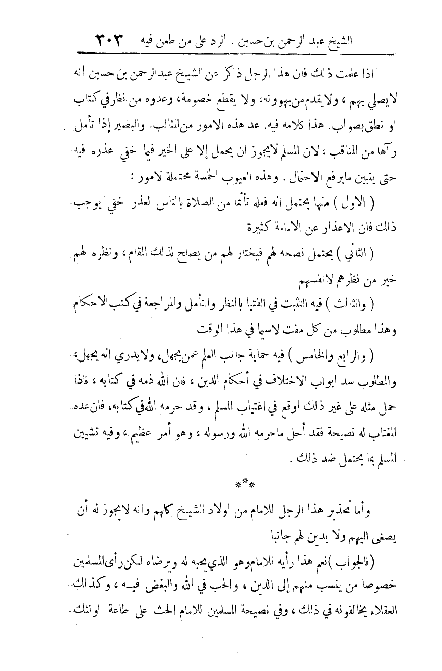 إذا علمت ذلك، فإن هذا الرجل ذكر عن الشيخ عبد الرحمن بن حسين أنه لا يصلي بهم، ولا يقدم من يهوونه، ولا يقطع خصومة، وعدوه من نظر في كتاب أو نطق بصواب. هذا كلامه فيه. عد هذه الأمور من المثالب.