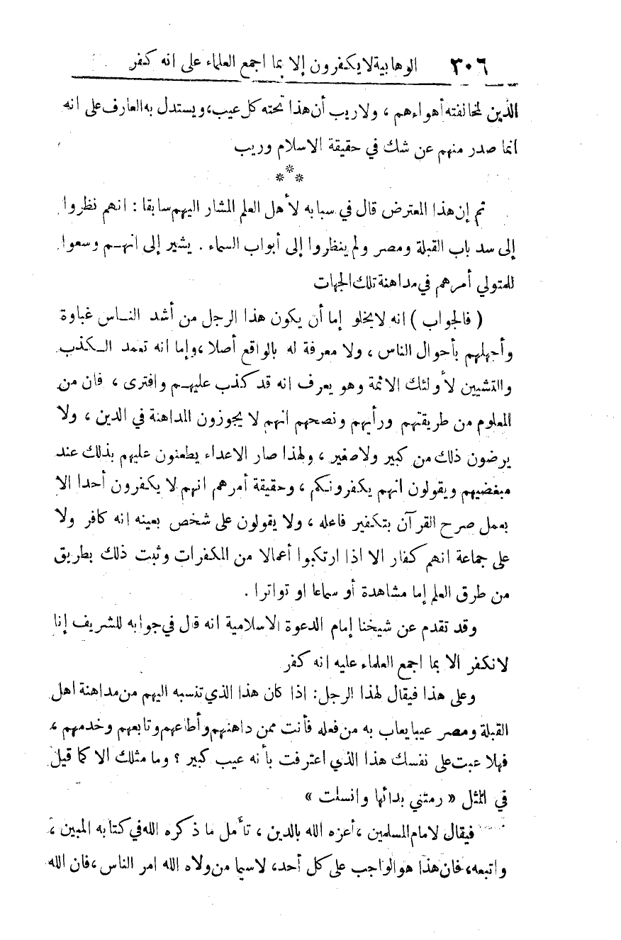 (فالجواب): إنه لا يخلو إما أن يكون هذا الرجل من أشد الناس غباوة وأجهلهم بأحوال الناس، ولا معرفة له بالواقع أصلا، وإما أنه تعمد الكذب والتشيين لأولئك الأئمة وهو يعرف أنه قد كذب عليهم وافترى، فإن من المعلوم من طريقتهم ورأيهم ونصحهم أنهم لا يجوزون المداهنة في الدين، ولا يرضون ذلك من كبير ولا صغير.
