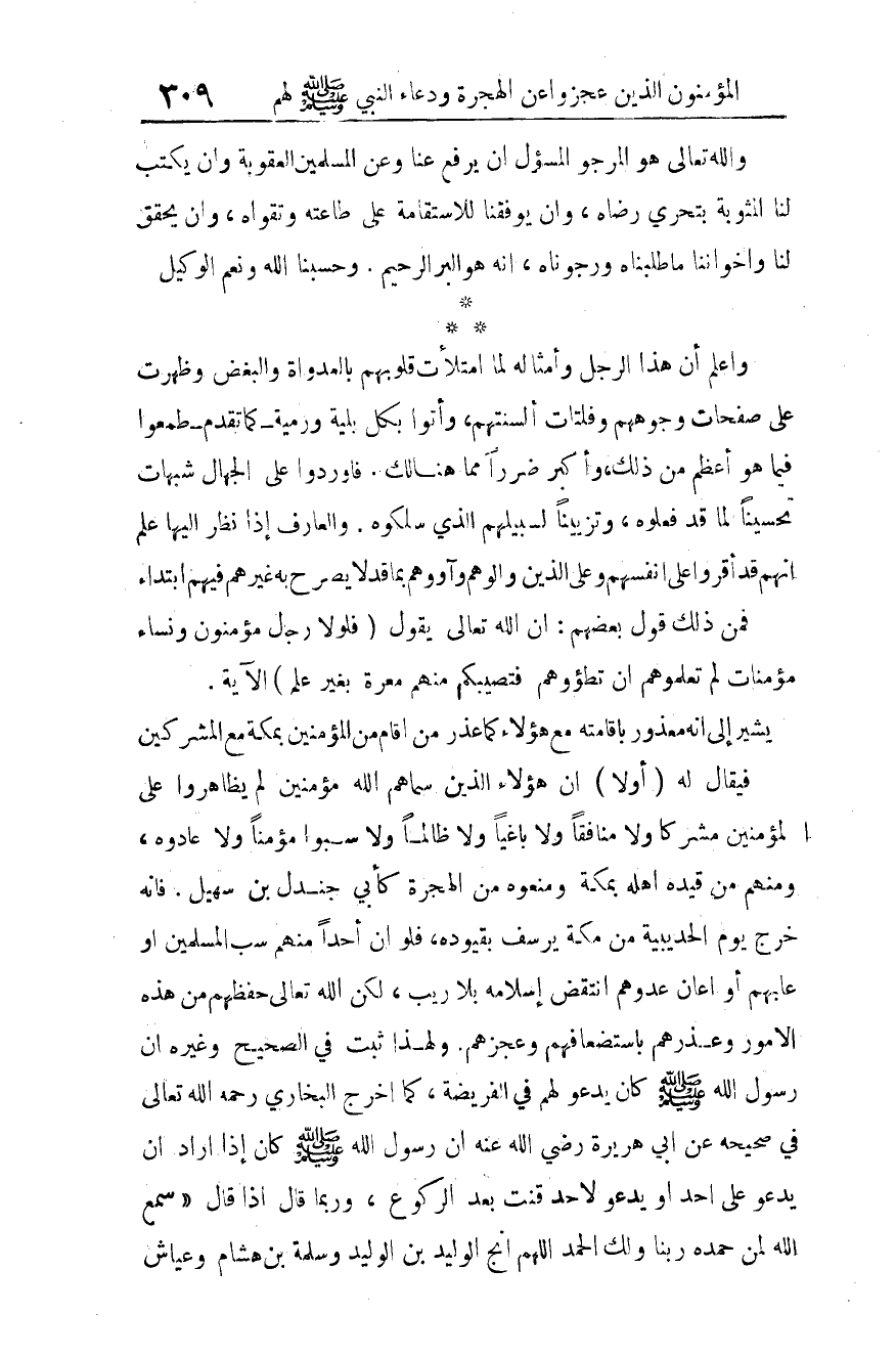 ومنهم من قيده أهله بمكة ومنعوه من الهجرة كأبي جندل بن سهيل. فإنه خرج يوم الحديبية من مكة يرسف بقيوده، فلو أن أحدا منهم سب المسلمين أو عابهم أو أعان عدوهم انتقض إسلامه بلا ريب، لكن الله تعالى حفظهم من هذه الأمور وعذرهم باستضعافهم وعجزهم، ولهذا ثبت في الصحيح وغيره أن رسول الله صلى الله عليه وسلم كان يدعو لهم في الفريضة، كما أخرج البخاري -رحمه الله تعالى- في صحيحه عن أبي هريرة رضي الله عنه أن رسول الله صلى الله عليه وسلم كان إذا أراد أن يدعو على أحد أو يدعو لأحد قنت بعد الركوع، وربما قال إذا قال سمع الله لمن حمده: "ربنا ولك الحمد اللهم أنج الوليد بن الوليد، وسلمة بن هشام، وعياش