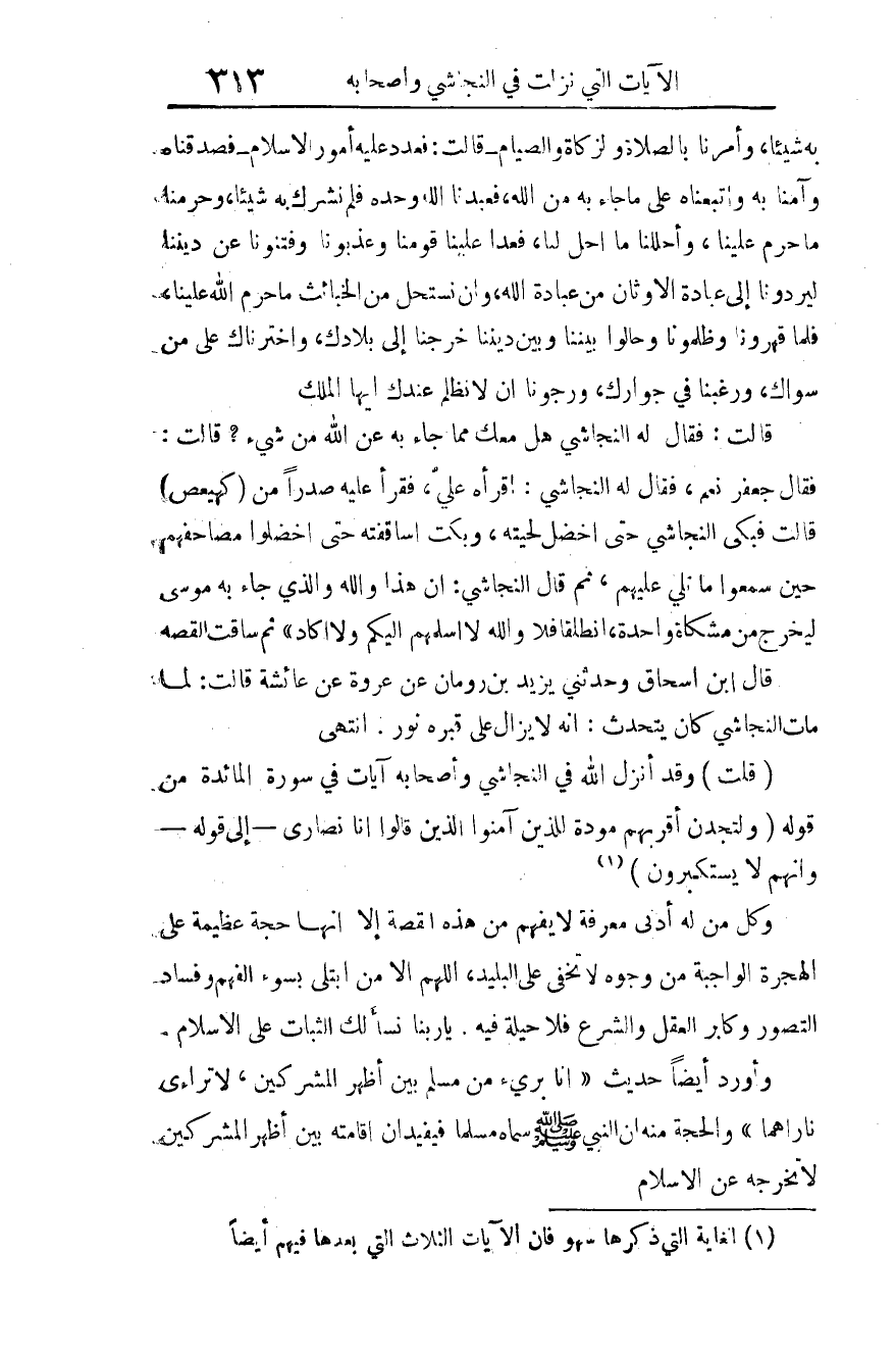 (قلت): وقد أنزل الله في النجاشي وأصحابه آيات في سورة المائدة من قوله: {وَلَتَجِدَنَّ أَقْرَبَهُمْ مَوَدَّةً لِلَّذِينَ آمَنُوا الَّذِينَ قَالُوا إِنَّا نَصَارَى} 1 إلى قوله: {وَأَنَّهُمْ لا يَسْتَكْبِرُونَ} 23.