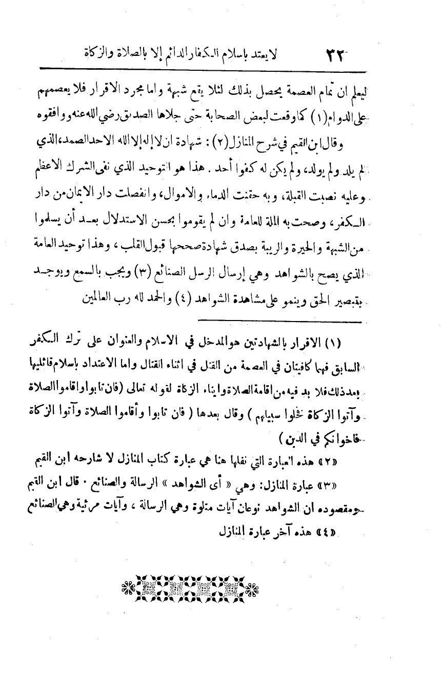 وقال ابن القيم في شرح المنازل 2: شهادة أن لا إله إلا الله الأحد الصمد، الذي لم يلد ولم يولد، ولم يكن له كفوا أحد. هذا هو التوحيد الذي نفى الشرك الأعظم، وعليه نصبت القبلة، وبه حقنت الدماء والأموال، وانفصلت دار الإيمان من دار الكفر، وصحت به الملة للعامة، وإن لم يقوموا بحسن الاستدلال بعد أن يسلموا من الشبهة والحيرة والريبة بصدق شهادة صححها قبول القلب، وهذا توحيد العامة، الذي يصح بالشواهد، وهي إرسال الرسل الصنائع 3، ويجب بالسمع، ويوجد بِتَبْصِيرِ الحق، وينمو على مشاهدة الشواهد 4. والحمد لله رب العالمين.