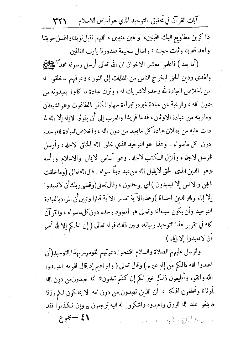 (أما بعد): فاعلموا معشر الإخوان أن الله تعالى أرسل رسوله محمدا صلى الله عليه وسلم بالهدى ودين الحق ليخرج الناس من الظلمات إلى النور، وعرفهم ما خلقوا له من إخلاص العبادة لله وحده لا شريك له، وترك عبادة ما كانوا يعبدونه من دون الله، والرغبة عن عبادة غيره والبراءة منها والكفر بالطاغوت -وهو الشيطان- وما زينه من عبادة الأوثان.