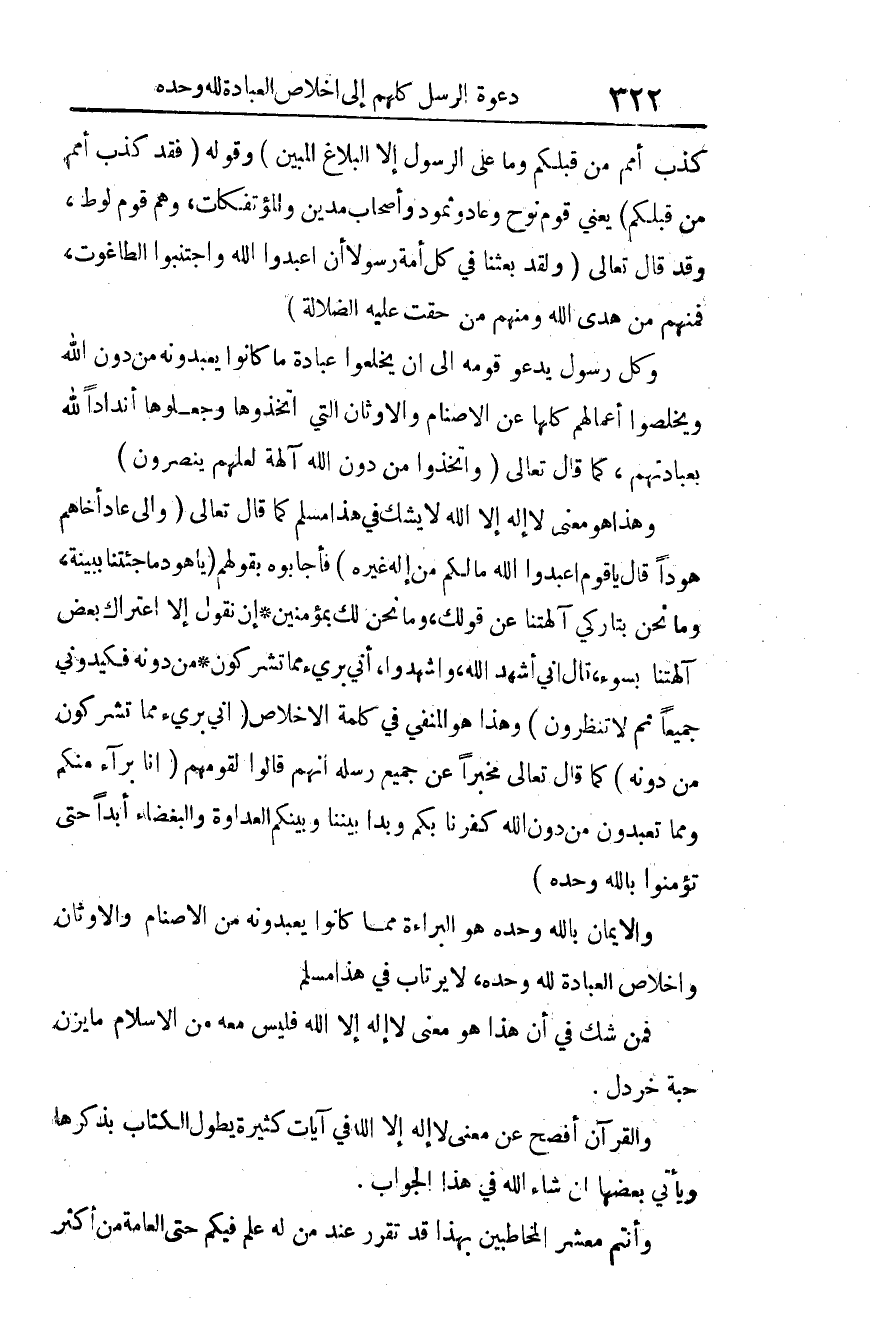 وهذا هو معنى لا إله إلا الله لا يشك في هذا مسلم كما قال تعالى: {وَإِلَى عَادٍ أَخَاهُمْ هُودًا قَالَ يَا قَوْمِ اعْبُدُوا اللَّهَ مَا لَكُمْ مِنْ إِلَهٍ غَيْرُهُ} 5، فأجابوه بقولهم: {قَالُوا يَا هُودُ مَا جِئْتَنَا بِبَيِّنَةٍ، وَمَا نَحْنُ بِتَارِكِي آلِهَتِنَا عَنْ قَوْلِكَ، وَمَا نَحْنُ لَكَ بِمُؤْمِنِينَ * إِنْ نَقُولُ إِلَّا اعْتَرَاكَ بَعْضُ آلِهَتِنَا بِسُوءٍ، قَالَ إِنِّي أُشْهِدُ اللَّهَ، وَاشْهَدُوا، أَنِّي بَرِيءٌ مِمَّا تُشْرِكُونَ * مِنْ دُونِهِ فَكِيدُونِي جَمِيعًا ثُمَّ لا تُنْظِرُونِ} 6.