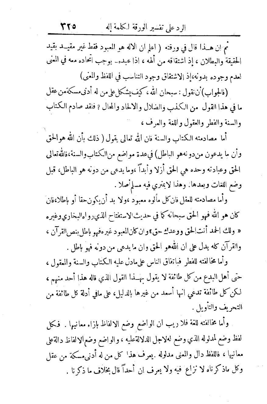 ثم إن هذا قال في ورقته: اعلم أن الإله هو المعبود فقط غير مقيد بقيد الحقيقة والبطلان إذ اشتقاقه من ألهه، إذا عبده، يوجب اتحاده معه في المعنى لعدم وجوده بدونه، إذ الاشتقاق وجود التناسب في اللفظ والمعنى.