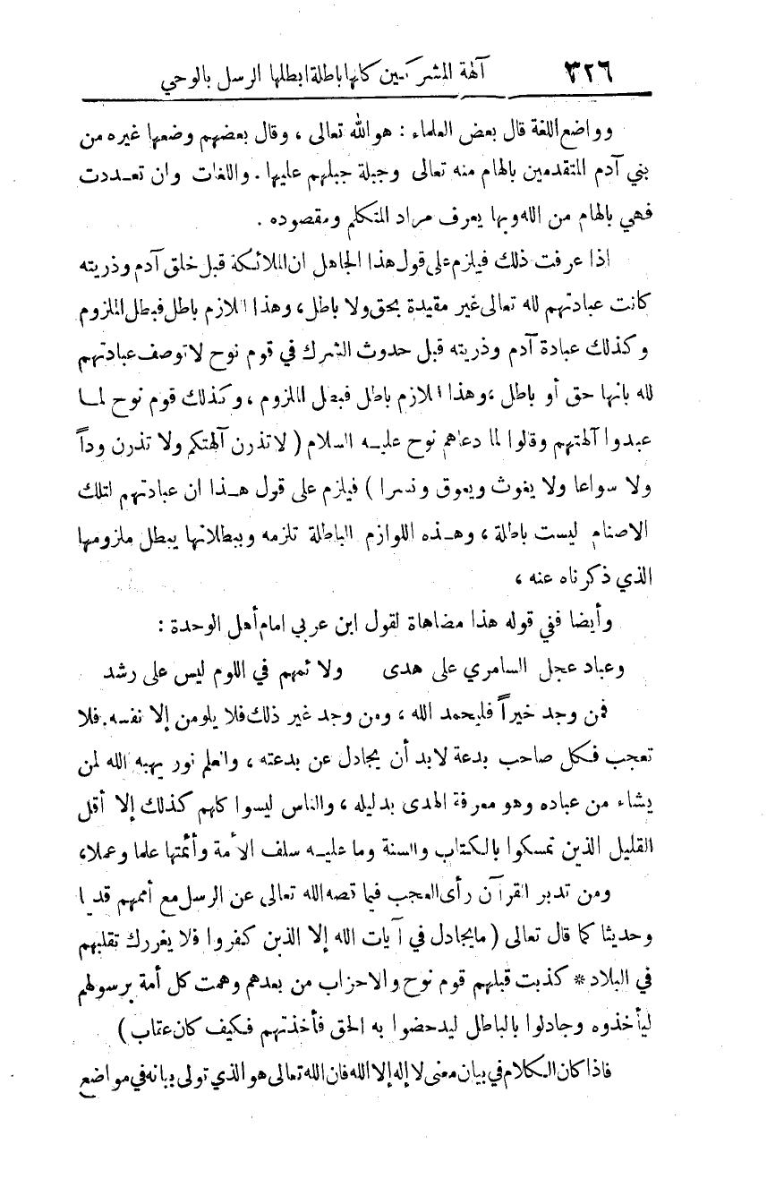 وكذلك قوم نوح لما عبدوا آلهتهم، وقالوا لما دعاهم نوح عليه السلام: {لا تَذَرُنَّ آلِهَتَكُمْ وَلا تَذَرُنَّ وَدًّا وَلا سُوَاعًا وَلا يَغُوثَ وَيَعُوقَ وَنَسْرًا} 1، فيلزم على قول هذا أن عبادتهم لتلك الأصنام ليست باطلة، وهذه اللوازم الباطلة تلزمه، وببطلانها يبطل ملزومها الذي ذكرناه عنه.
