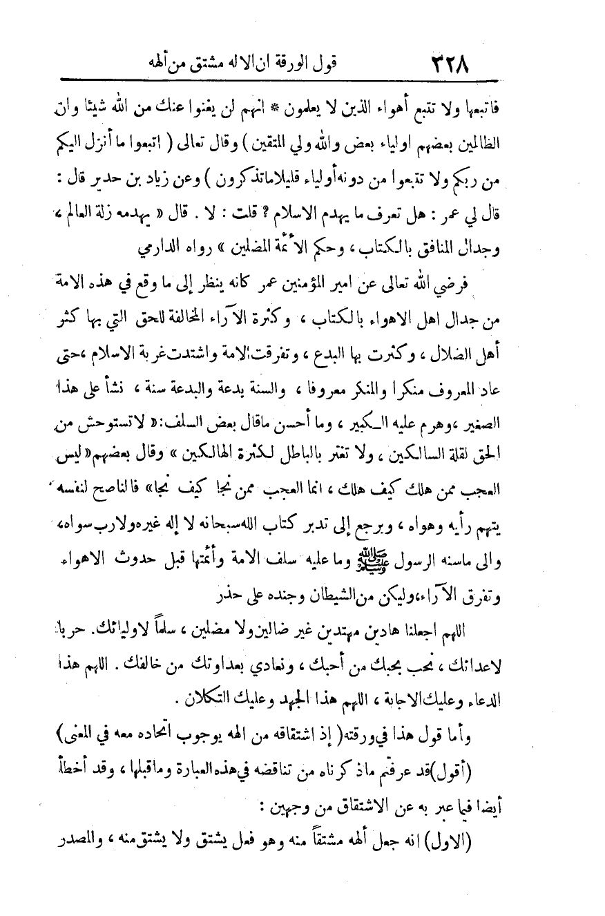 فرضي الله تعالى عن أمير المؤمنين عمر كأنه ينظر إلى ما وقع في هذه الأمة من جدال أهل الأهواء بالكتاب، وكثرة الآراء المخالفة للحق التي بها كثر أهل الضلال، وكثرت بها البدع، وتفرقت الأمة واشتدت غربة الإسلام، حتى عاد المعروف منكرا والمنكر معروفا، والسنة بدعة والبدعة سنة، نشأ على هذا الصغير، وهرم عليه الكبير.