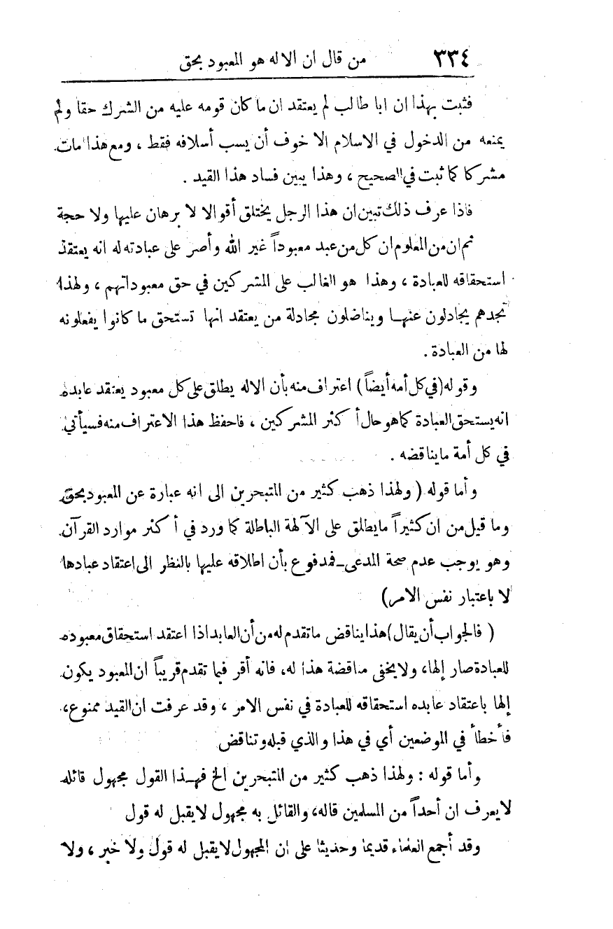 (فالجواب) أن يقال: هذا يناقض ما تقدم له من أن العابد إذا اعتقد استحقاق معبوده للعبادة صار إلها، ولا يخفى مناقضة هذا له، فإنه أقر فيما تقدم قريبا أن المعبود يكون إلها باعتقاد عابده استحقاقه للعبادة في نفس الأمر، وقد عرفت أن القيد ممنوع، فأخطأ في الموضعين أي: في هذا والذي قبله وتناقض.