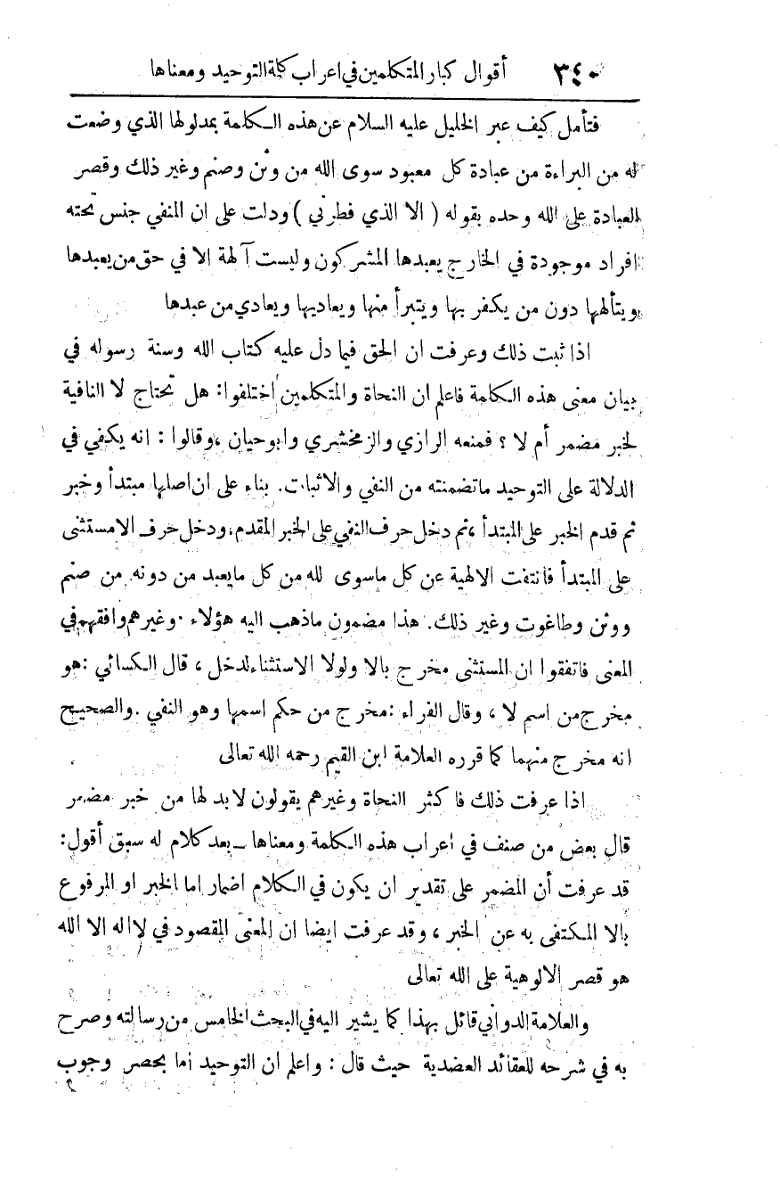 إذا عرفت ذلك، فأكثر النحاة وغيرهم يقولون لا بد لها من خبر مضمر قال بعض من صنف في إعراب هذه الكلمة ومعناها -بعد كلام له سبق- أقول: قد عرفت أن المضمر على تقدير أن يكون في الكلام إضمار إما الخبر أو المرفوع بإلا المكتفى به عن الخبر، وقد عرفت أيضا أن المعنى المقصود في لا إله إلا الله هو قصر الألوهية على الله تعالى.
